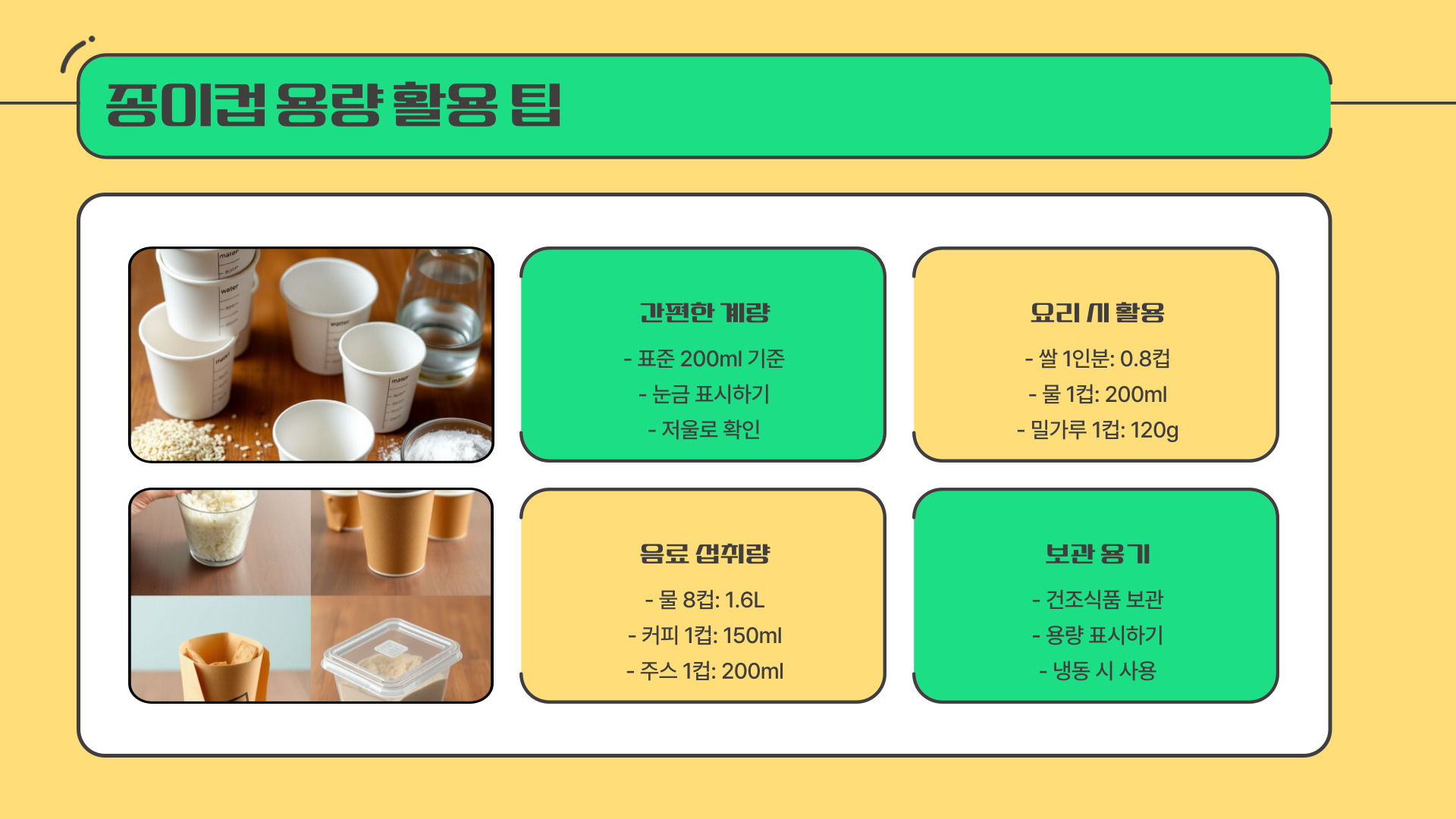 종이컵은 다양한 용도로 사용되는 필수 아이템입니다. 특히 카페나 행사에서 종이컵을 자주 접하게 되죠. 하지만 종이컵의 1컵 용량에 대한 정확한 이해가 없다면 불필요한 낭비가 발생할 수 있습니다. 이번 포스팅에서는 종이컵의 용량에 대한 정보를 자세히 알아보겠습니다.