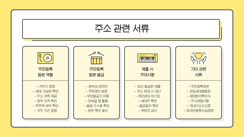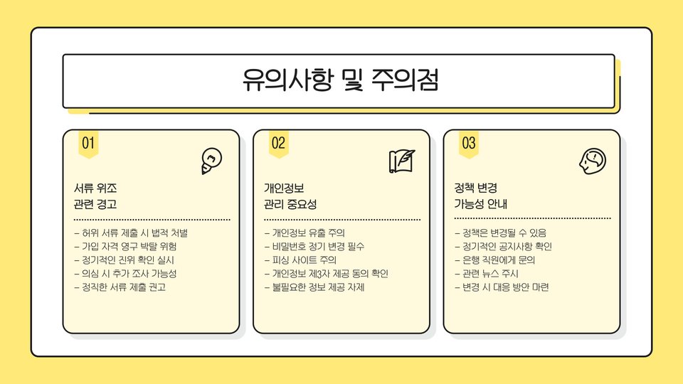 서류를 준비하는 과정에서 몇 가지 유의해야 할 점이 있습니다. 먼저, 각 서류는 정확하고 최신의 정보를 담고 있어야 합니다. 예를 들어, 주민등록등본의 경우 본인의 현재 주소지가 정확히 기재되어 있어야 하며, 소득증명서는 최근 1년간의 소득을 반영해야 합니다.