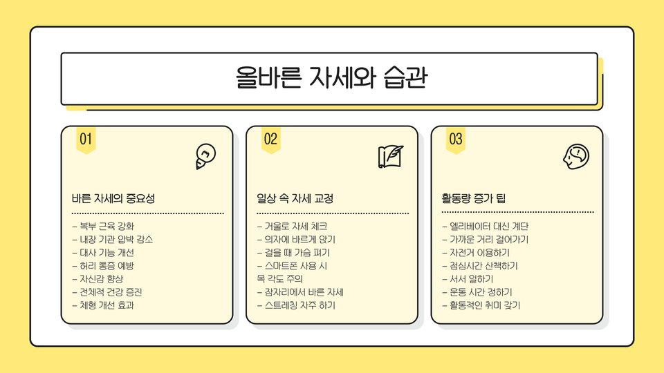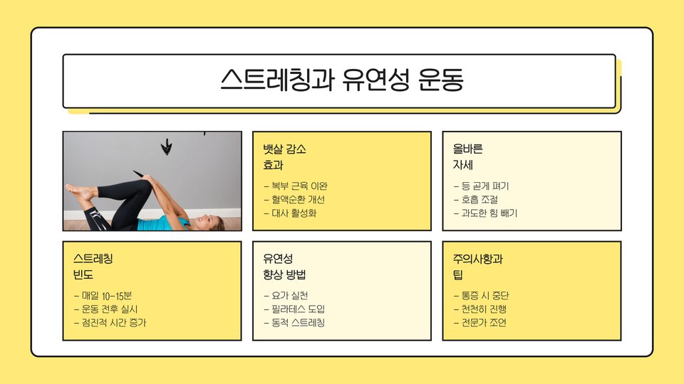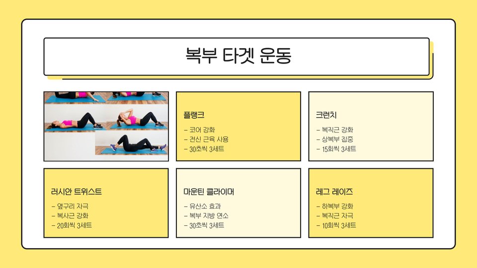 | 복부 강화 운동 | 플랭크, 크런치 등 매일 10분 |