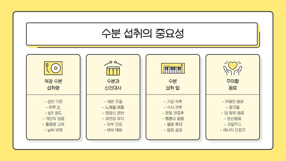 또한, 충분한 수분 섭취도 필수입니다. 물은 체내 대사를 원활하게 하고,