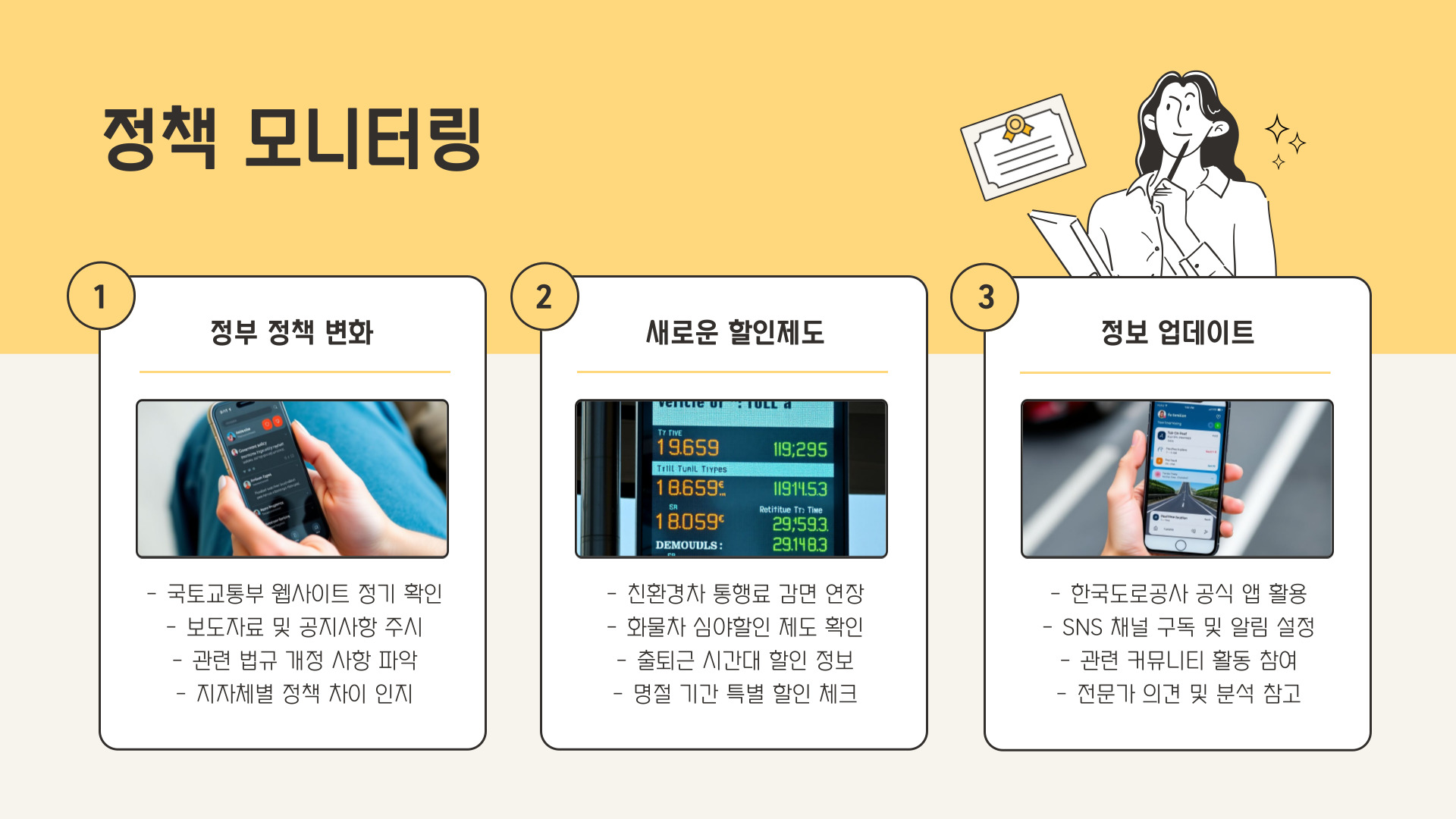 중요 팁: 통행료 검색 및 절약을 위해서는 항상 최신 정보를 확인하는 것이 중요합니다. 다양한 할인 혜택을 놓치지 않기 위해 정기적으로 업데이트된 정보를 체크하세요.