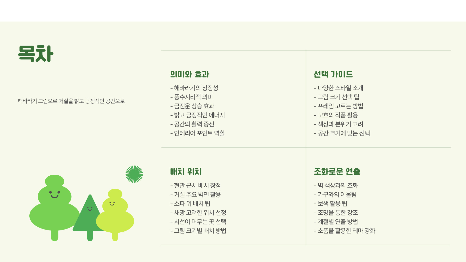 이렇게 해바라기그림을 활용하여 거실의 분위기를 변화시킬 수 있는 여러 가지 방법을 소개했습니다. 작은 변화를 통해 일상에 활력을 더하는 것은 어떤 것이든 가능하다는 점을 잊지 마세요! 해바라기그림으로 여러분의 거실을 더욱 생동감 넘치는 공간으로 만들어 보세요.