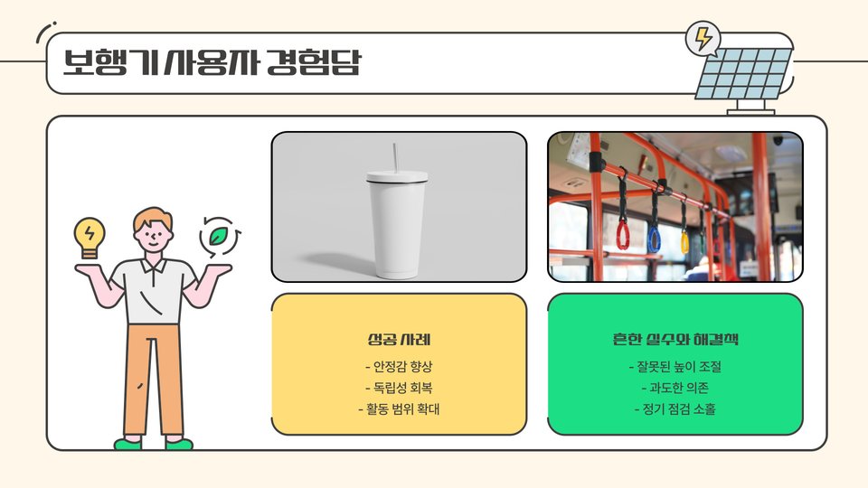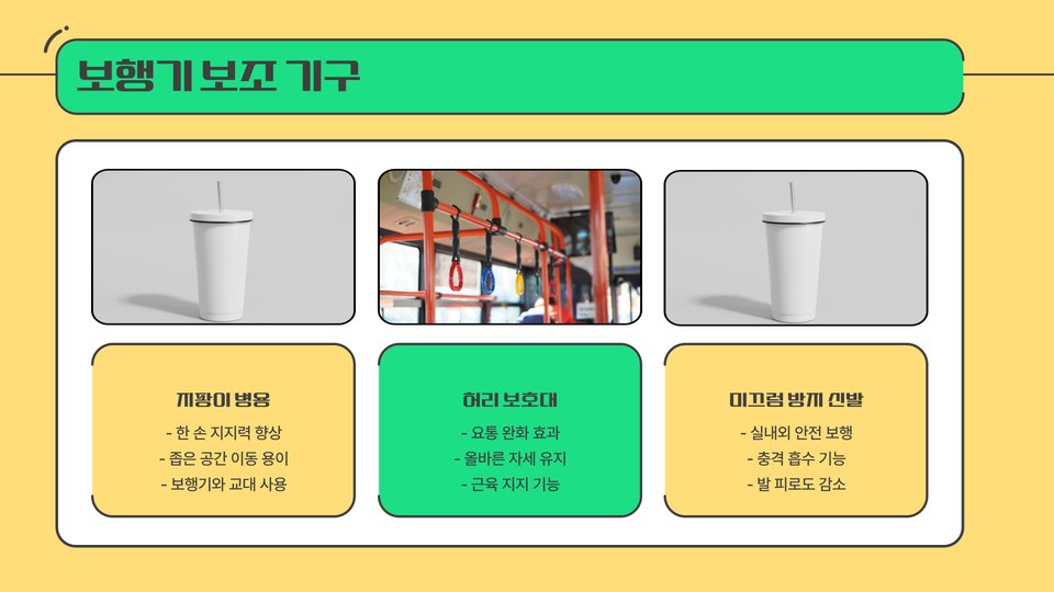 - 전동 보행기: 편리한 조작, 장시간 이동에 적합.