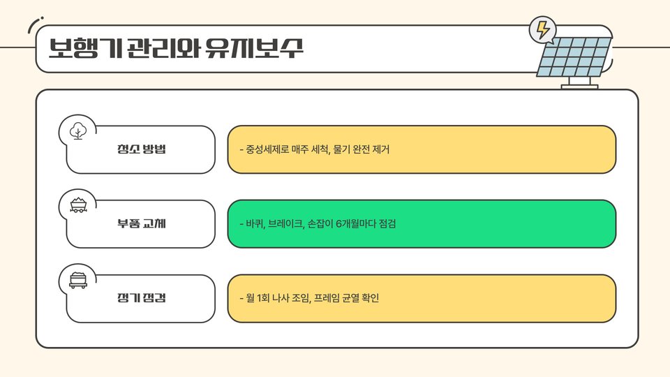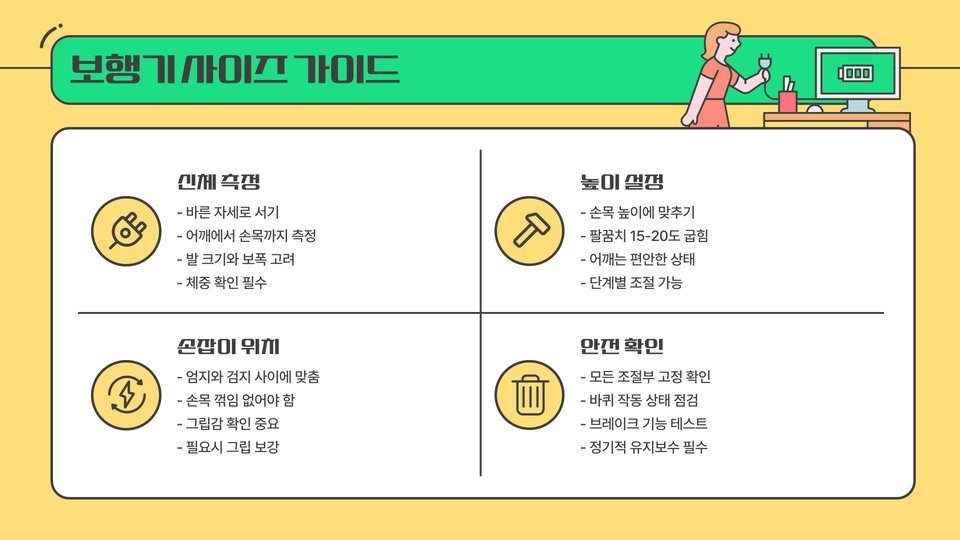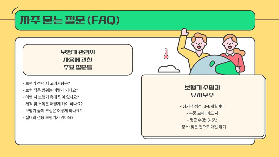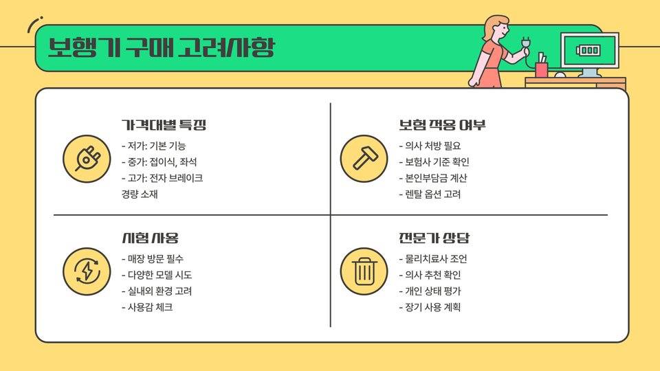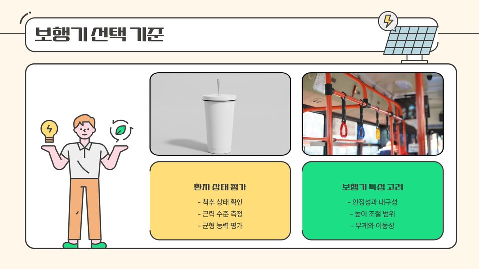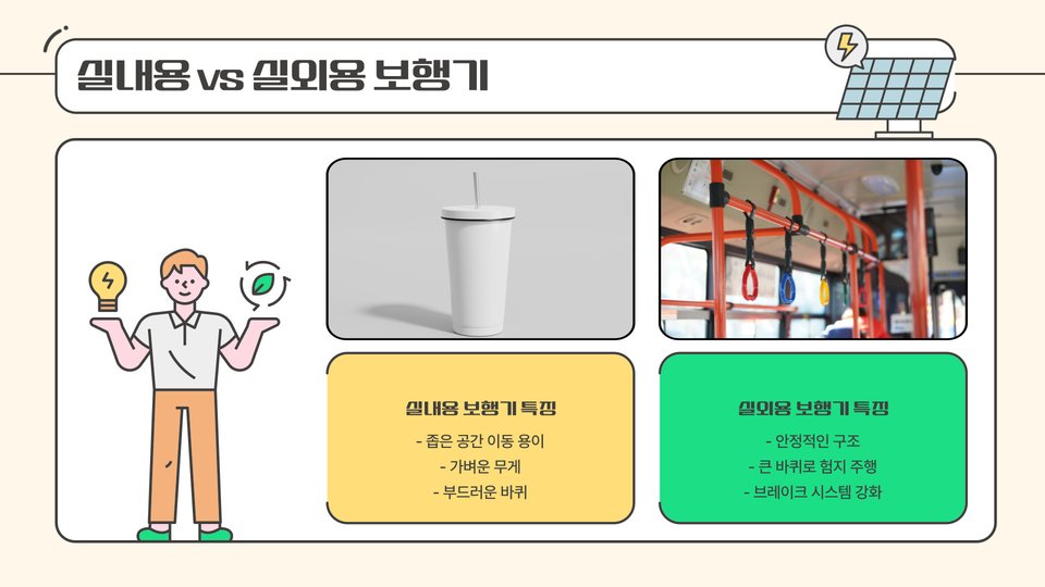 - 전동 보행기: 편리한 조작, 장시간 이동에 적합.
