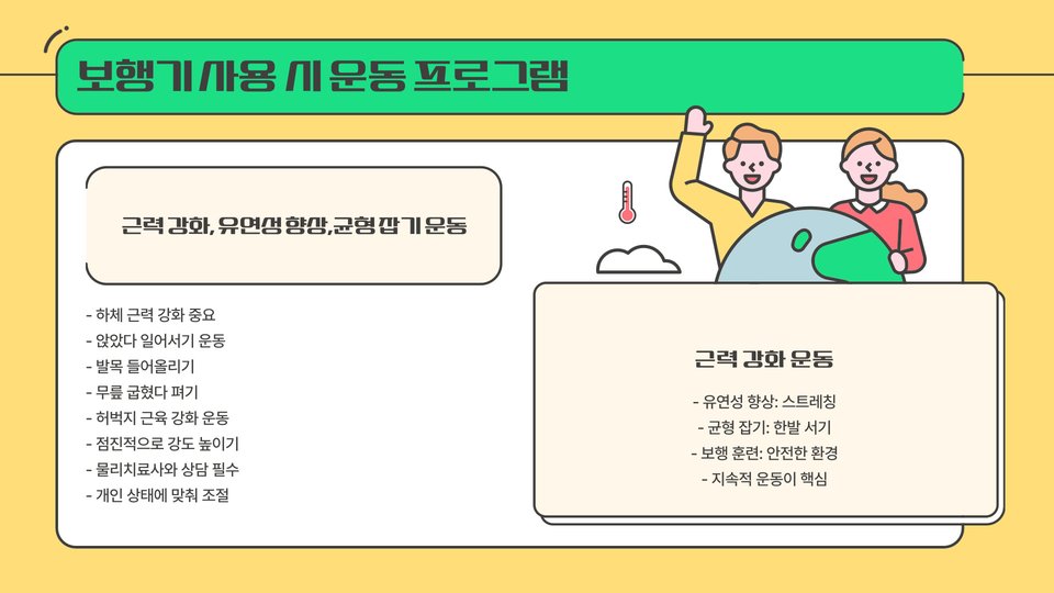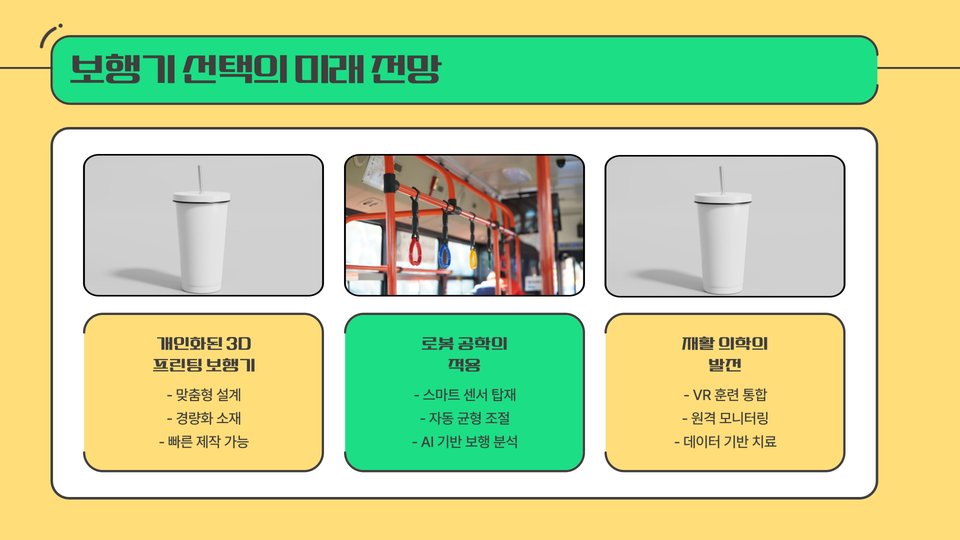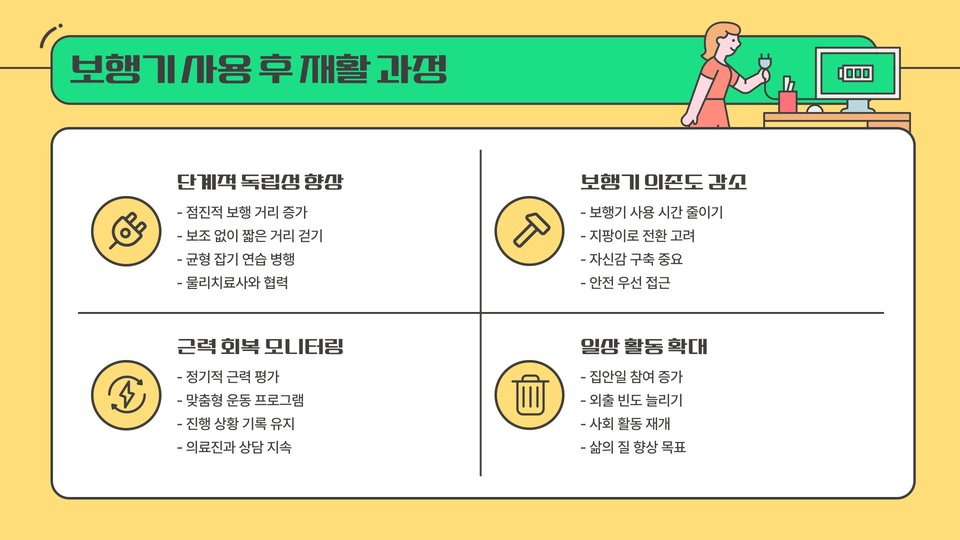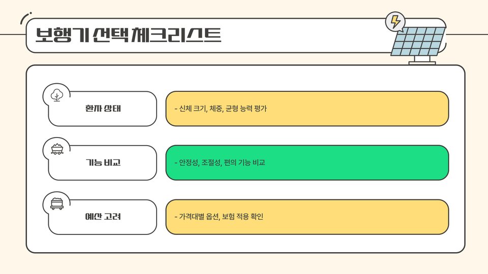 - 전동 보행기: 자동으로 움직이는 기능이 있어, 체력이 약한 환자에게 유용합니다.