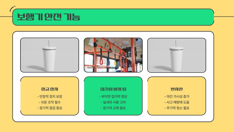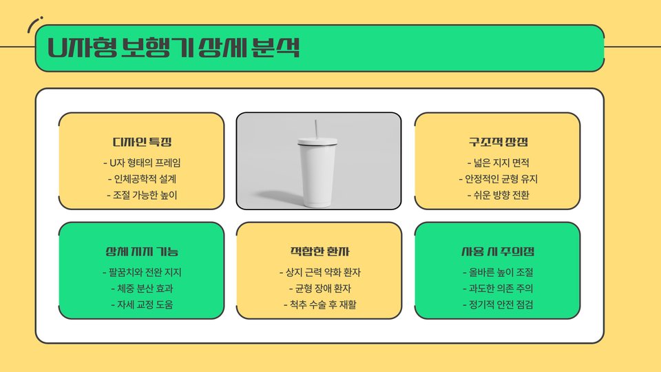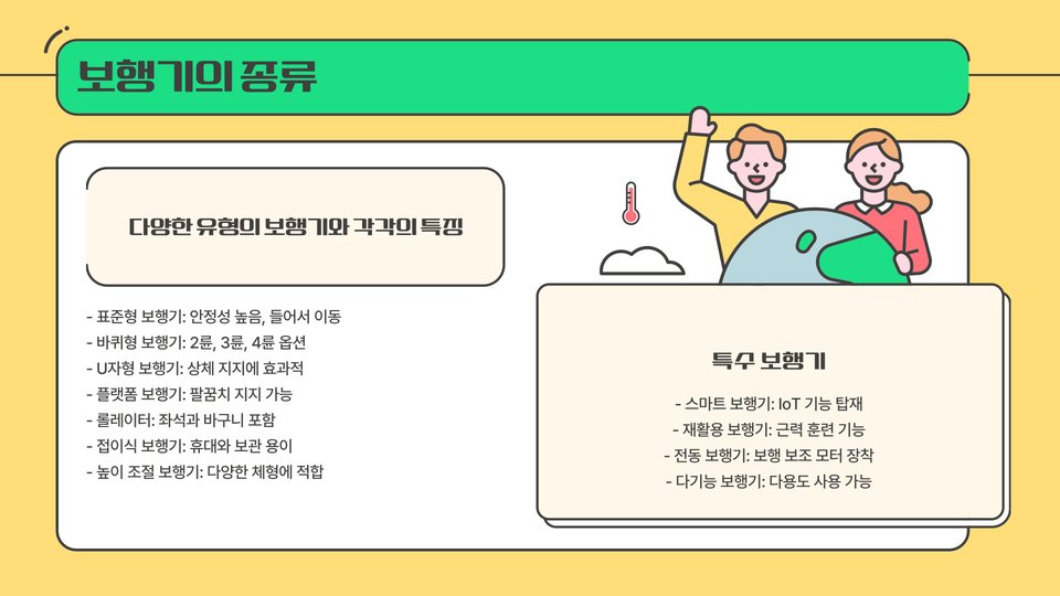 - 기본 보행기: 강한 지지력을 제공하며, 안정성이 뛰어납니다.