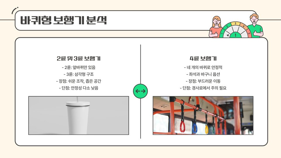 - 수동 보행기: 가격 저렴, 근육 사용 필요.