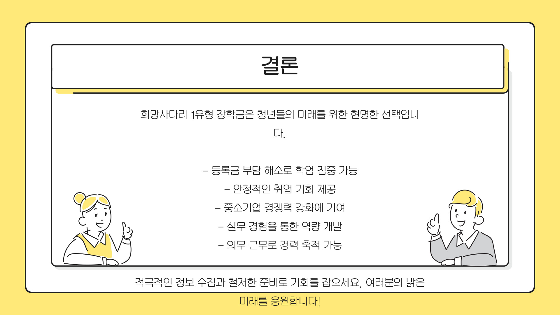 결론적으로, 희망사다리 1유형은 저소득층 학생들에게 꼭 필요한 지원 프로그램입니다. 이 장학금은 단순히 재정적인 지원을 넘어서, 학생들이 자신의 길을 찾을 수 있도록 도와주는 다양한 기회들을 제공합니다. 그러므로 이를 잘 알고 준비하는 것이 중요합니다.