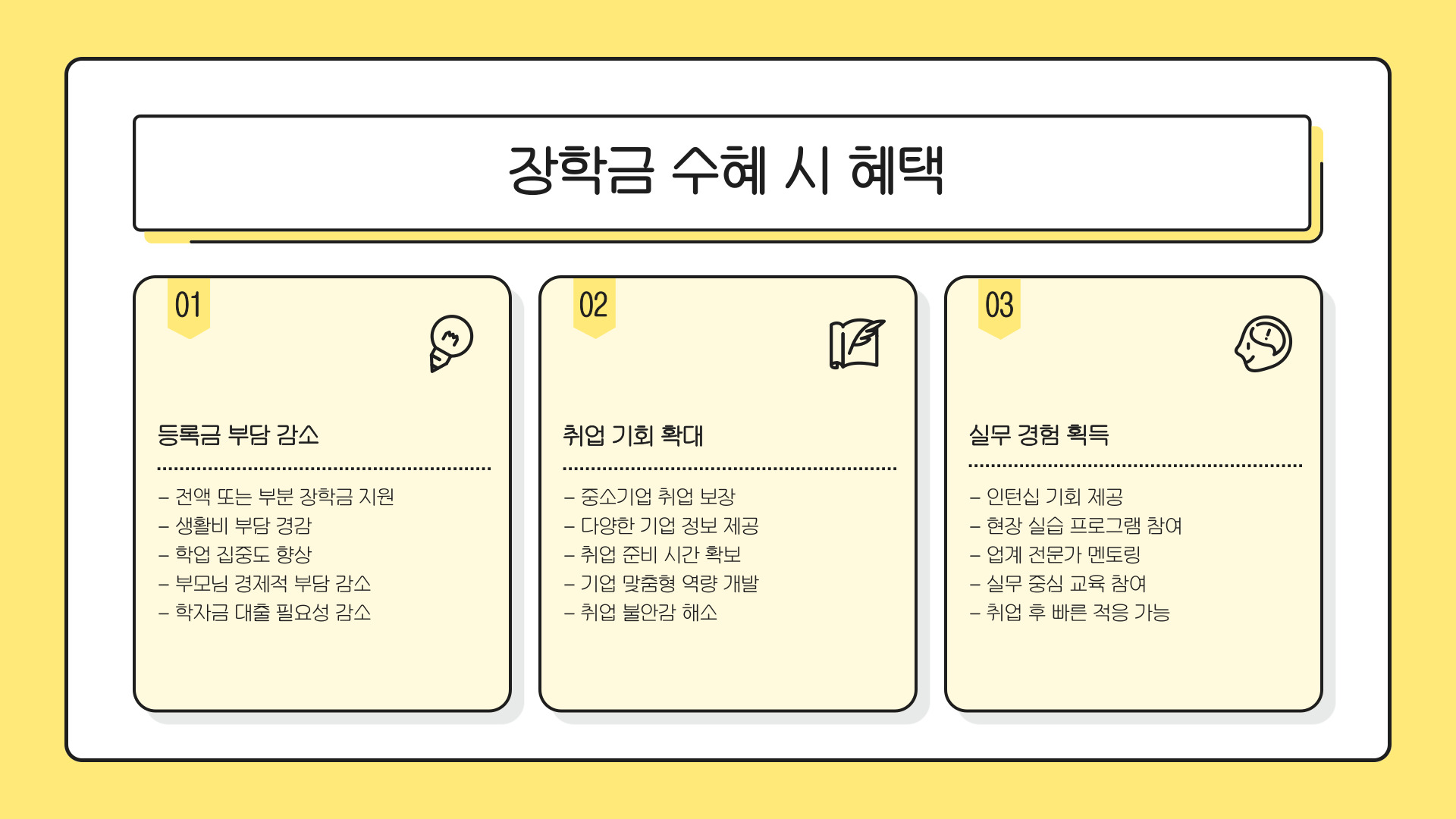 희망사다리 1유형 장학금의 가장 큰 장점은 경제적 부담 경감입니다. 학생들은 장학금을 통해 학비와 생활비를 지원받을 수 있어, 학업에 더욱 집중할 수 있습니다. 또한, 이 장학금은 학생들에게 경험을 쌓을 수 있는 기회를 제공합니다, 다양한 활동에 참여할 수 있는 여력을 주기 때문입니다. 이처럼 희망사다리 장학금은 단순한 금전적 지원을 넘어, 학생들에게 긍정적인 영향을 미치고 있습니다.