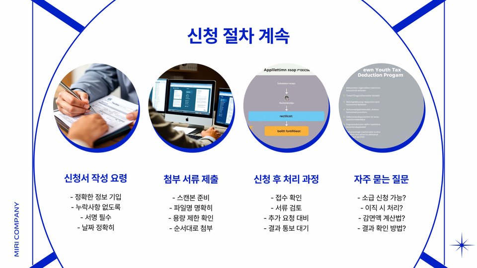 신청 절차는 명확하고 이해하기 쉽습니다. 먼저, 중소기업청에 소득세 감면 신청서를 제출해야 합니다. 이 서류에는 청년의 개인 정보와 소속 기업의 정보가 포함되어야 하며, 관련 서류를 첨부하는 것을 잊지 말아야 합니다.
