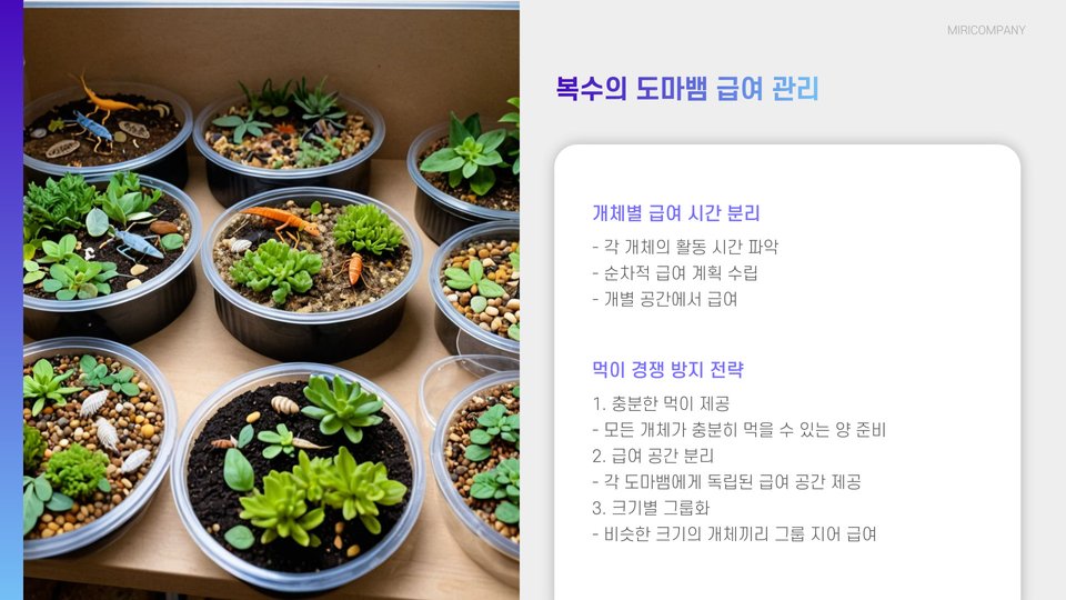 도마뱀에게 제공하는 먹이는 그들의 건강에 큰 영향을 미칩니다. 다양한 곤충, 채소, 과일 등을 골고루 섭취할 수 있도록 해야 합니다. 특히, 영양소가 부족한 경우에는 비타민과 미네랄 보충제를 추가하는 것이 좋습니다. 또한, 먹이는 신선하고 깨끗해야 하며, 도마뱀의 크기에 맞는 크기로 잘라주는 것이 중요합니다. 이렇게 함으로써 도마뱀은 쉽게 먹이를 섭취할 수 있습니다.