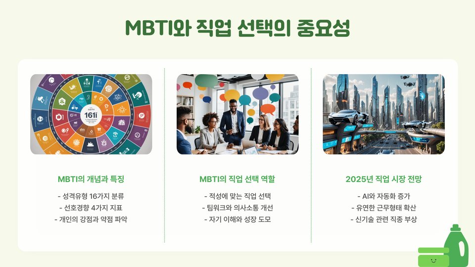 2025년에는 MBTI 성격 유형에 맞는 직업 선택이 더욱 중요해질 것입니다. 자신의 성격 유형을 이해하고, 그에 맞는 직업을 선택하는 것이 장기적인 직업 만족도와 성공에 큰 영향을 미칠 것입니다. 각 유형에 맞는 직업 추천을 참고하여, 자신의 미래를 설계해보세요.