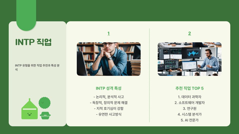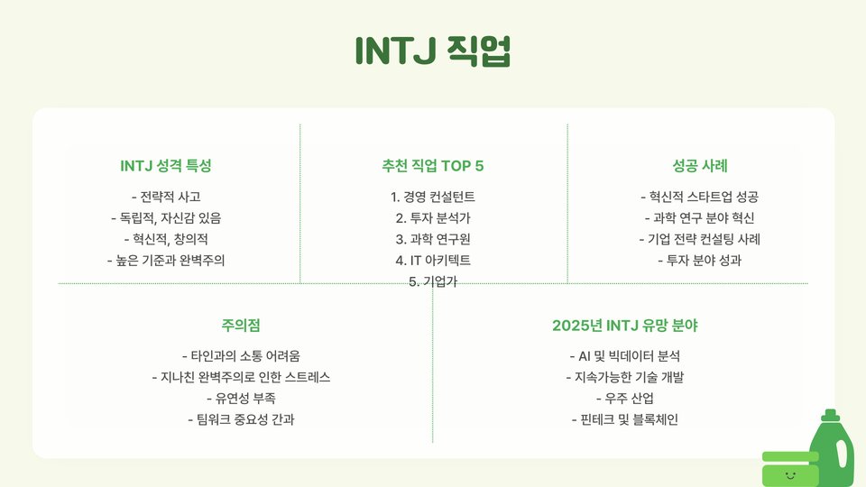| INTJ | 데이터 과학자, IT 전략가, 사업 컨설턴트 |
