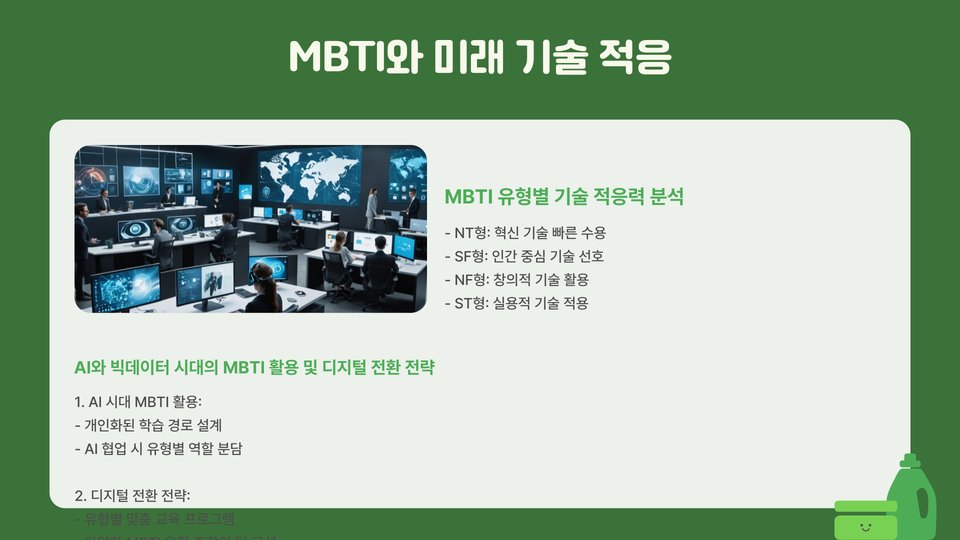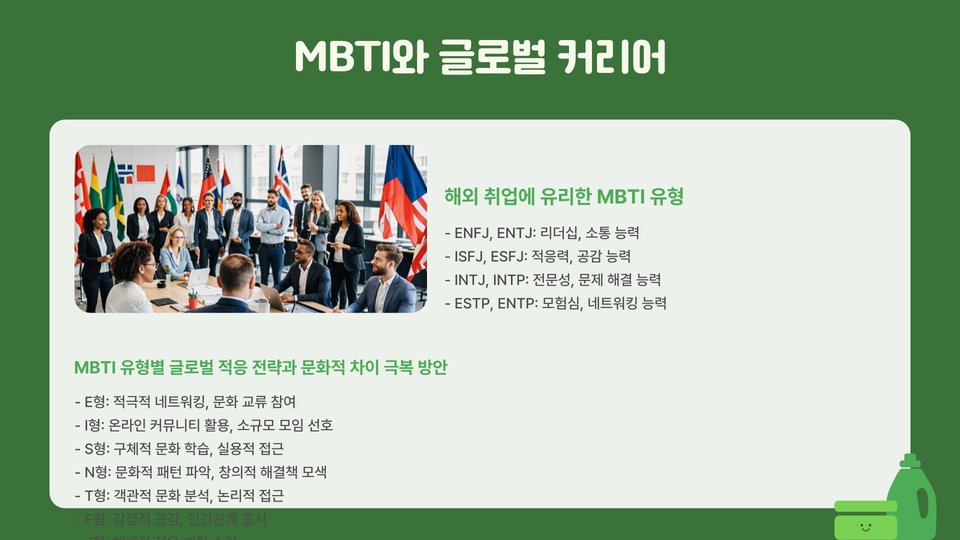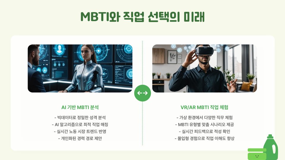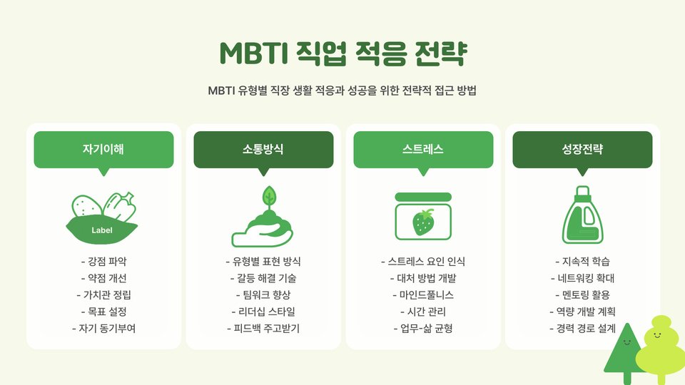 2025년에는 MBTI 성격 유형에 맞는 직업 선택이 더욱 중요해질 것입니다. 자신의 성격 유형을 이해하고, 그에 맞는 직업을 선택하는 것이 장기적인 직업 만족도와 성공에 큰 영향을 미칠 것입니다. 각 유형에 맞는 직업 추천을 참고하여, 자신의 미래를 설계해보세요.