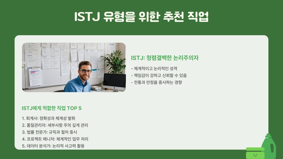 | ISTJ | 회계사, 법률 전문가, 프로젝트 관리자 |