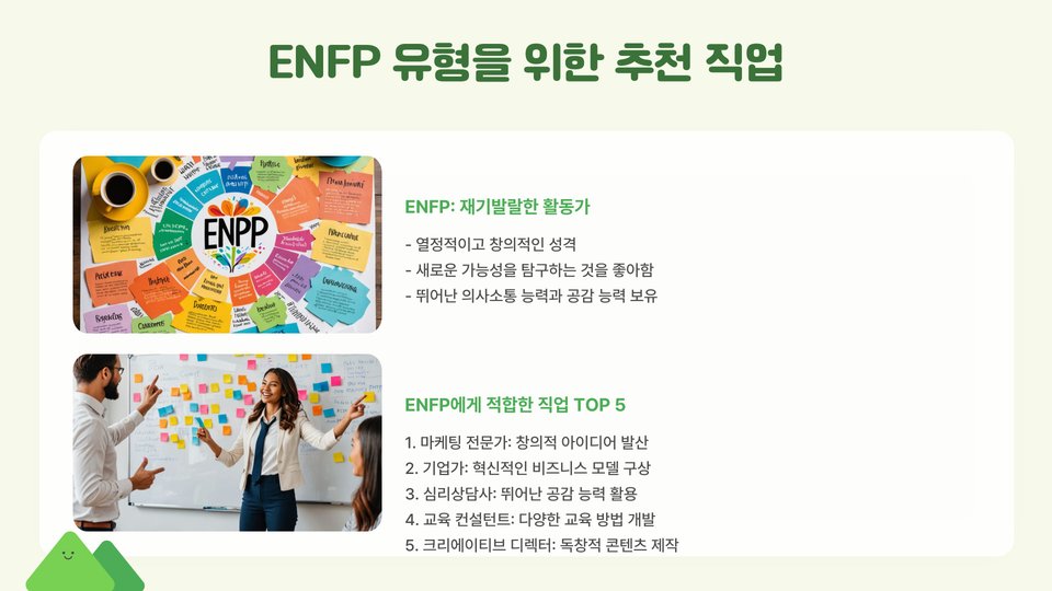 ENFP 유형은 창의력과 사교성이 뛰어난 특징을 가지고 있습니다. 이들은 새로운 아이디어와 기회를 탐색하는 것을 즐깁니다. 따라서 마케팅 전문가나 디자인 전문가와 같은 직업이 잘 어울립니다. 이러한 직업은 ENFP가 가진 창의력을 발휘할 수 있는 기회를 제공합니다.