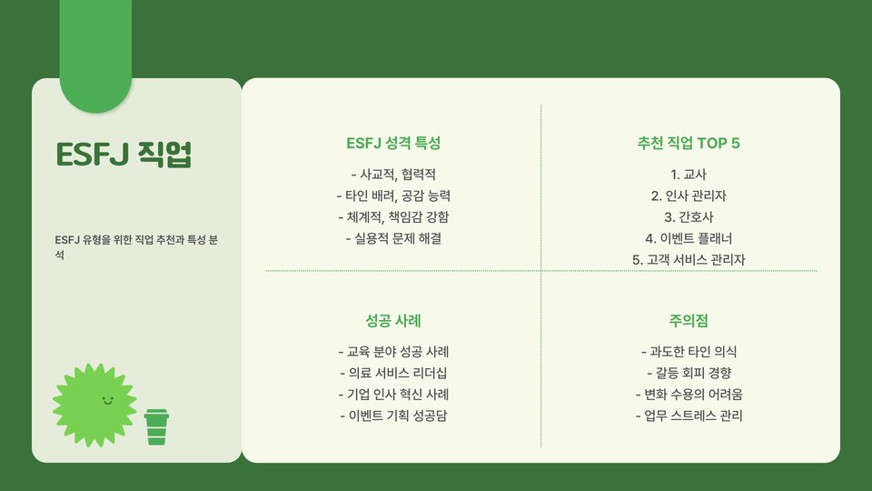 | ESFJ | 사회복지사, 교육자, 인사 전문가 |
