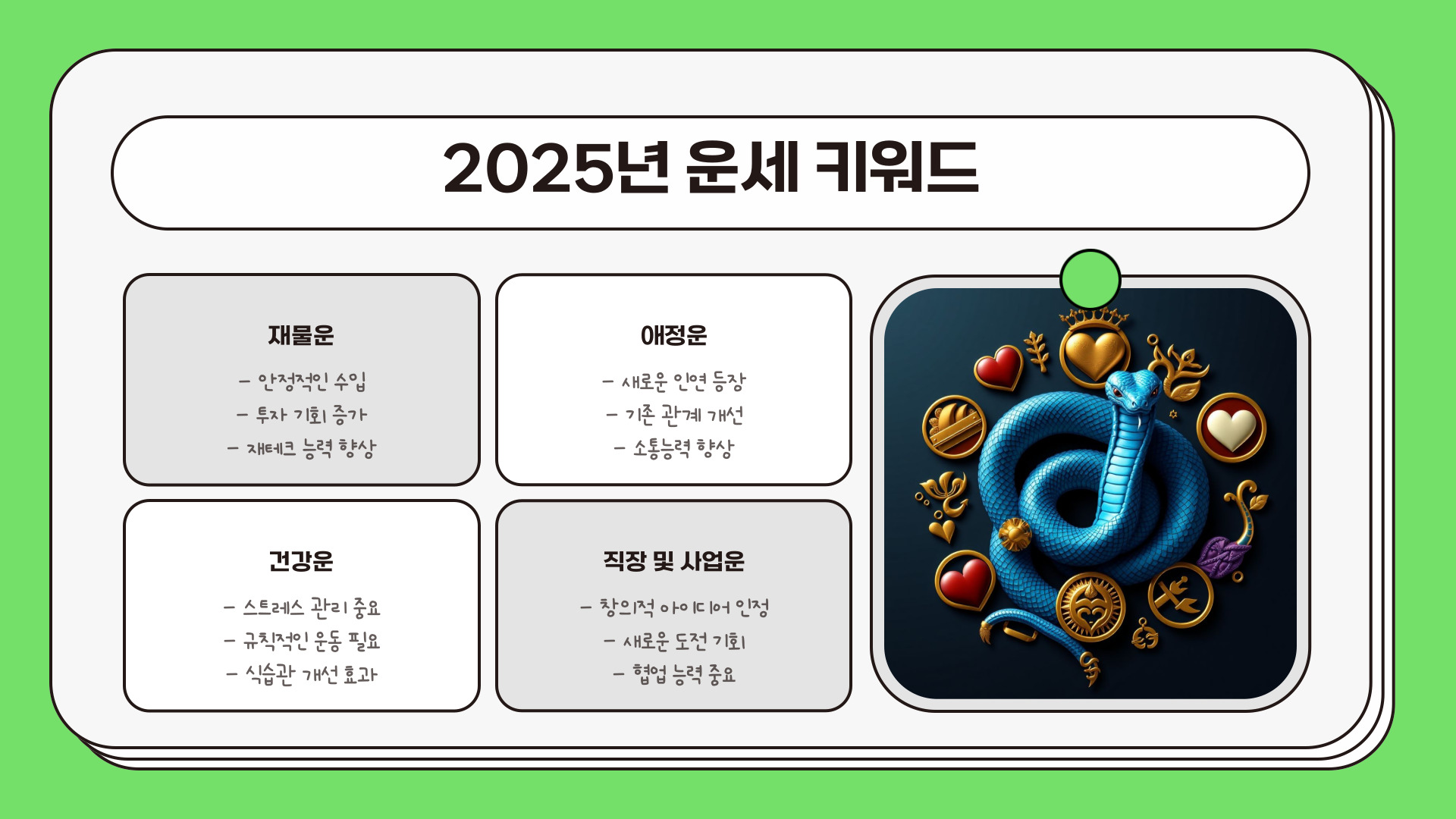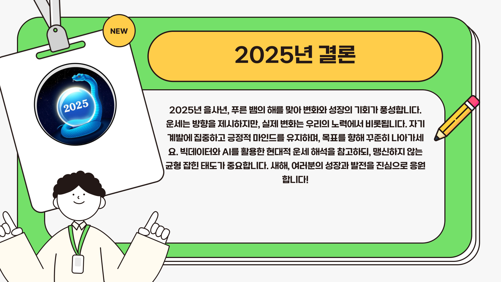 결국, 신년운세는 우리의 삶을 더 나은 방향으로 이끌어주는 가이드가 될 수 있습니다. 그러므로, 이 기회를 잘 활용하여 2025년을 성공적으로 맞이하시기 바랍니다.