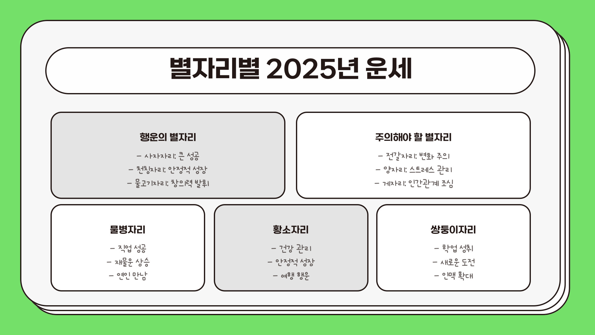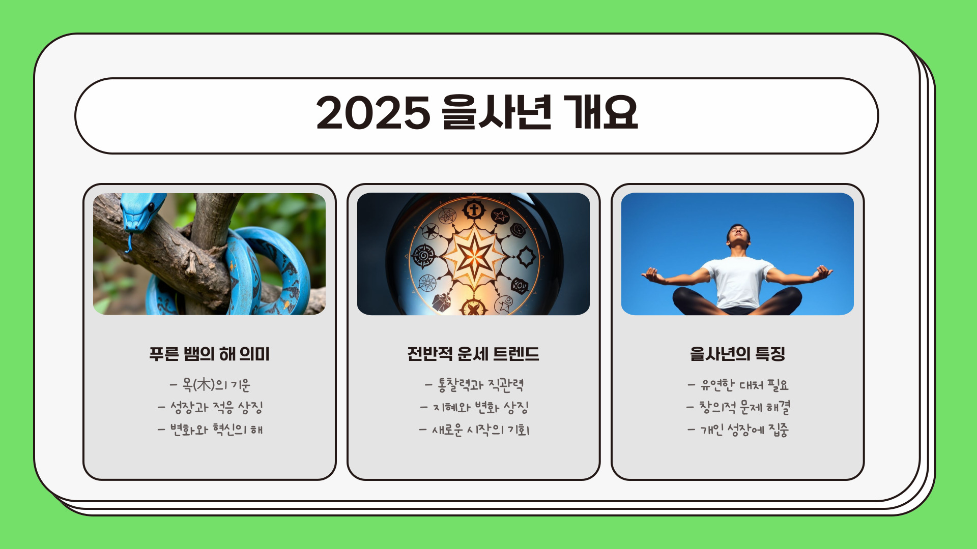 2025년 신년운세는 각 띠별로 다르게 나타나며, 이 해가 가져올 기회와 도전은 무궁무진합니다. 운세를 통해 자신을 되돌아보고, 긍정적인 마음가짐으로 새해를 맞이하는 것이 중요합니다. 각 띠별로 자신의 자리를 찾아가며, 운세를 효과적으로 활용하는 방법을 익혀보세요.