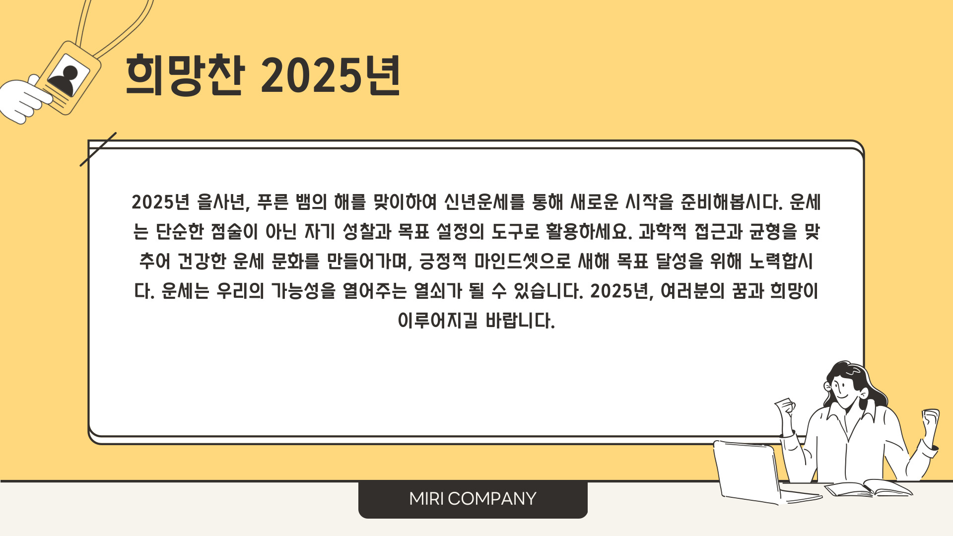2025년 신년운세를 시작하는 것은 단순히 운세를 보는 것을 넘어서, 자신의 인생을 계획하고 긍정적인 방향으로 나아가는 중요한 과정입니다. 운세를 정확히 분석하고 이에 따라 자신의 행동을 조정한다면, 한 해를 더 의미 있게 보낼 수 있을 것입니다. 신년운세를 통해 긍정적인 에너지를 끌어들이고, 나아가 자신의 가능성을 확장해 나가길 바랍니다.