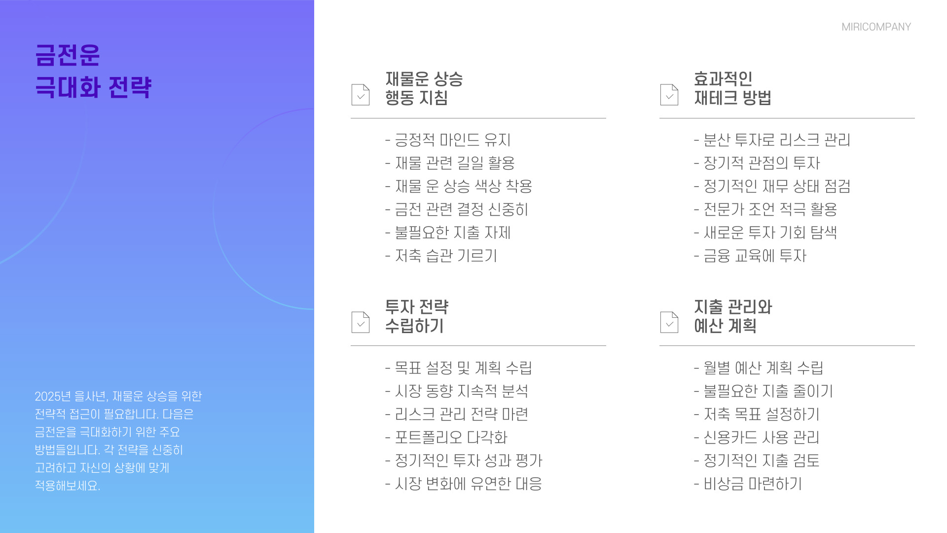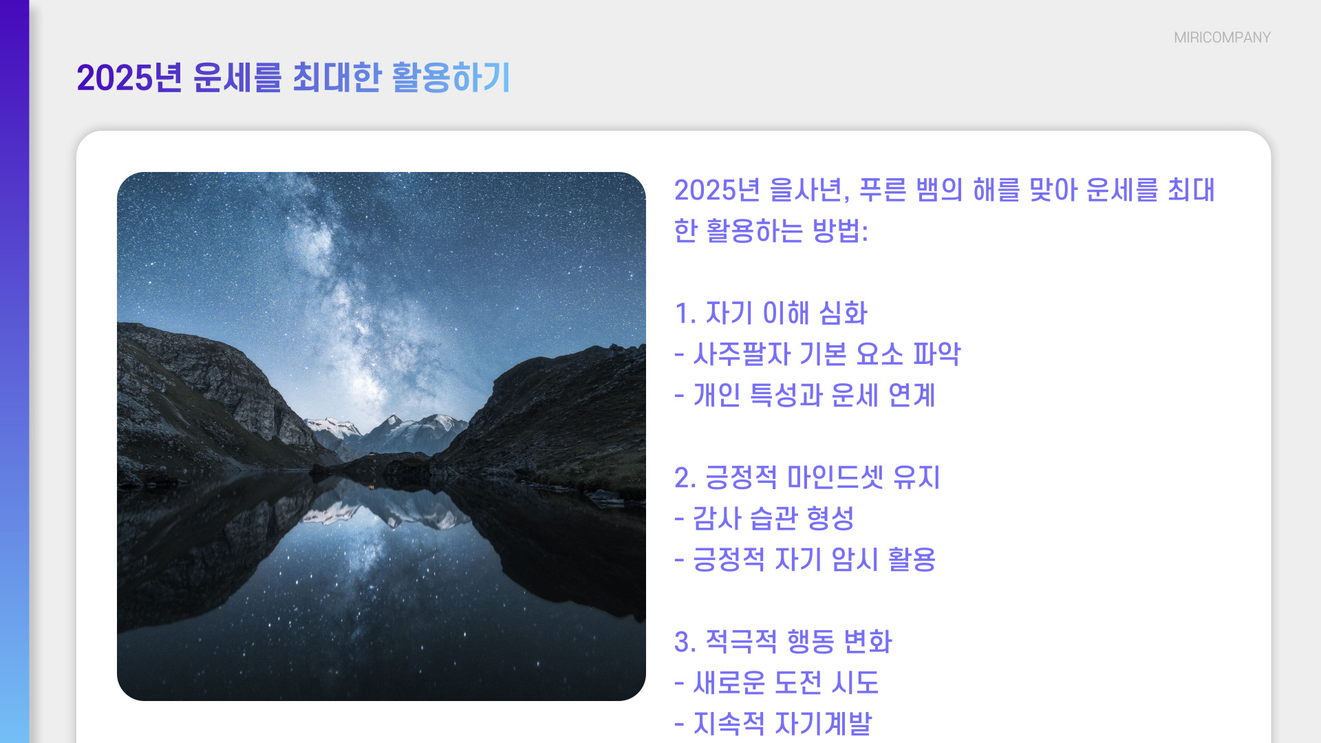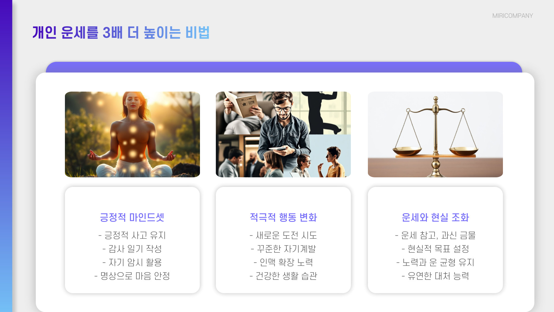 | 목표 설정 | 운세에 맞춰 구체적이고 측정 가능한 목표를 설정 |