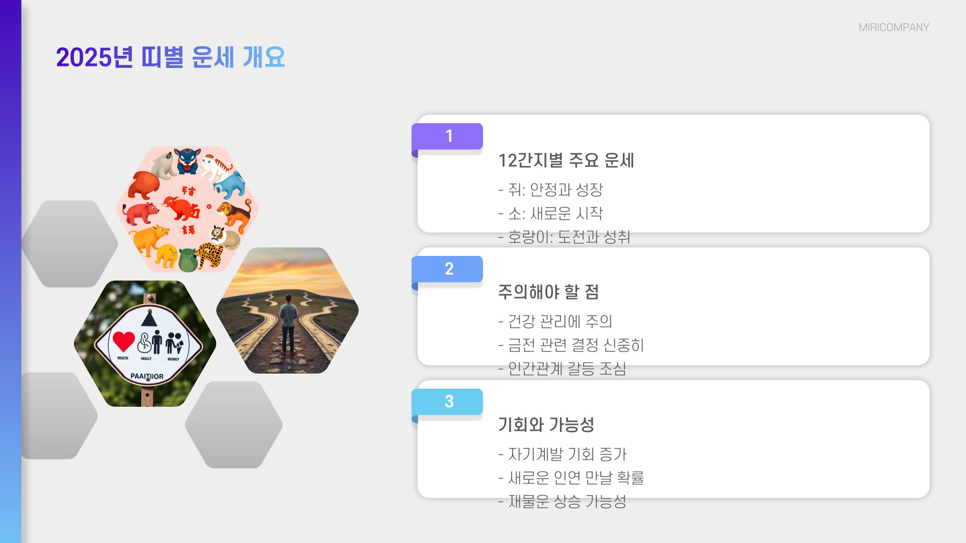 신년운세는 개인의 운세를 점치는 기초가 됩니다. 해마다 변화하는 기운을 이해하고, 이를 통해 다가오는 한 해를 준비하는 것이 중요합니다. 특히, 각기 다른 띠와 생년월일에 따라 다르게 나타나는 운세의 흐름을 파악하는 것이 신년운세의 핵심입니다. 이를 통해 어떤 기회를 잡아야 하는지, 어떤 위험을 피해야 하는지 명확히 알 수 있습니다.