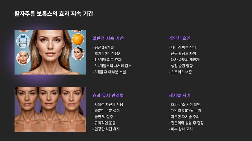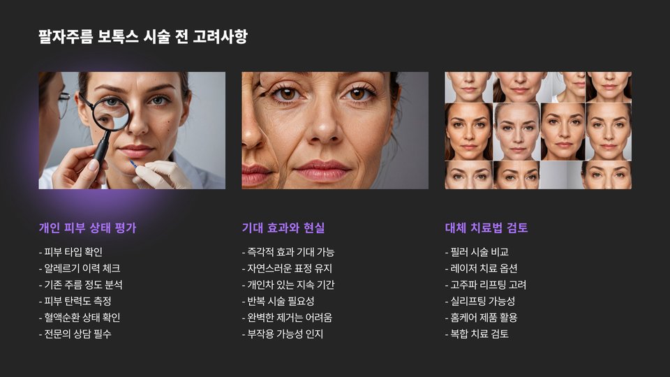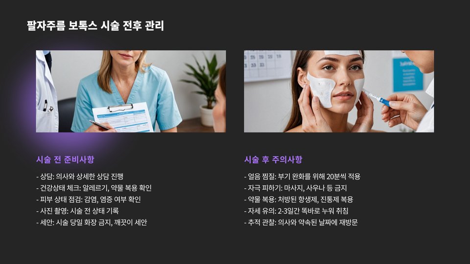 팔자주름 보톡스는 효과적인 주름 개선 방법이지만, 부작용과 시술 후 관리에 주의해야 합니다. 여러 후기를 통해 긍정적인 효과를 확인할 수 있지만, 개인의 피부 상태와 전문가의 조언을 바탕으로 신중한 선택이 필요합니다.