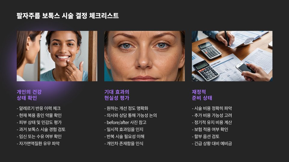 팔자주름 보톡스를 고려할 때는 몇 가지 포인트를 기억해야 합니다. 첫째, 시술 전 충분한 상담을 통해 자신의 피부 상태와 적합한 시술 방법에 대해 알아보는 것이 중요합니다. 둘째, 경험이 풍부한 전문가를 선택하여 부작용을 최소화해야 합니다. 셋째, 시술 후 적절한 관리와 주의사항을 준수하는 것이 중요합니다.