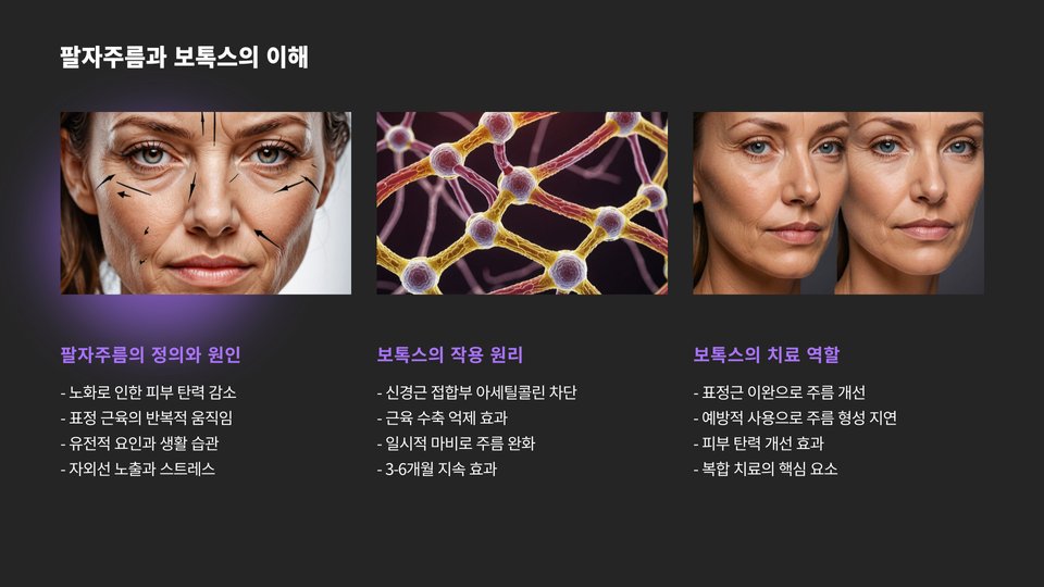 보톡스는 보톨리늄 톡신이라는 물질을 기반으로 한 미용 시술입니다. 주로 주름 제거와 같은 미용 목적뿐만 아니라, 다양한 의료적 혜택을 제공하기 위해 사용되기도 합니다. 팔자주름의 경우, 이러한 보톡스 주사를 통해 근육의 긴장을 완화시켜 주름이 덜 도드라지게 만들 수 있습니다. 보톡스는 주름을 감소시키는 데 있어 효과적인 방법으로 인정받고 있습니다.