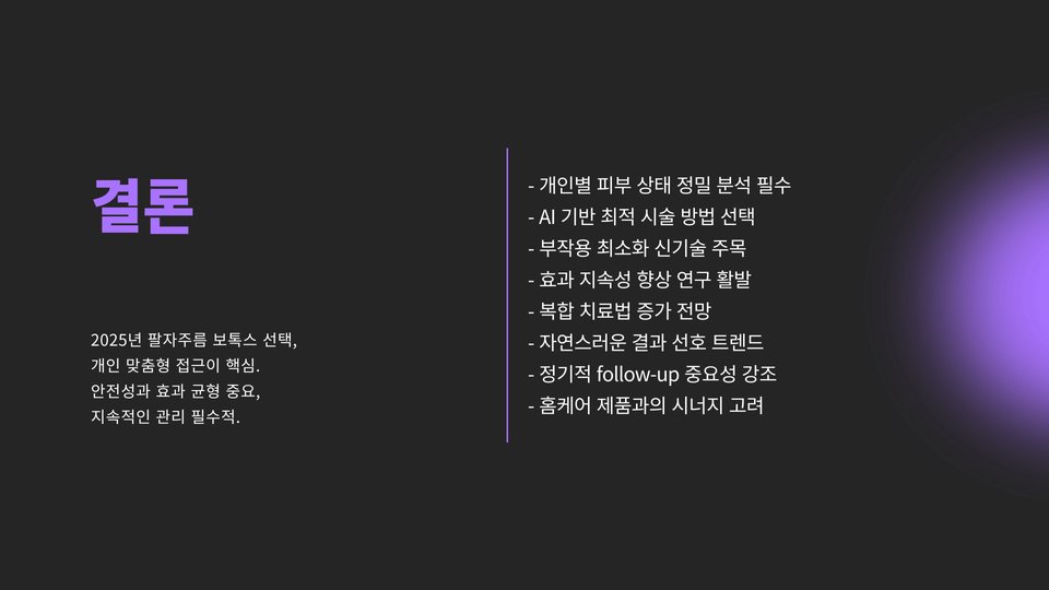 2025년 팔자주름 보톡스 후기는 시술의 효과와 부작용 모두를 고려해야 하는 중요한 요소입니다. 보톡스는 제대로 활용할 경우 효과적인 주름 개선 방법일 수 있지만, 의료 전문가와의 상담을 통해 개인의 피부 상태에 맞는 결정이 필요합니다. 부작용을 항상 염두에 두고, 적절한 사후 케어를 통해 만족스러운 결과를 얻길 바랍니다.