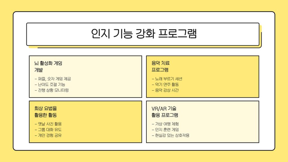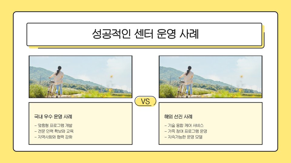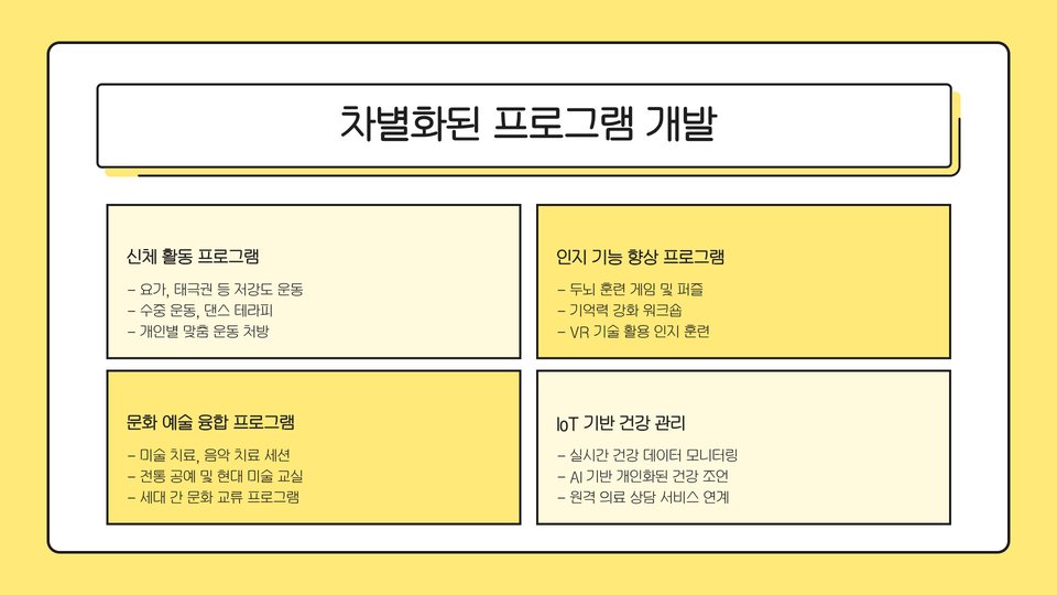 센터의 성공적인 운영을 위해서는 다양한 프로그램의 개발이 필요합니다. 노인의 신체적, 정서적 요구를 충족시키기 위한 프로그램은 매우 중요합니다. 예를 들어, 미술 치료, 음악 치료, 그리고 운동 프로그램 등이 포함될 수 있습니다.
