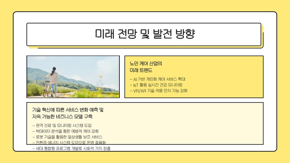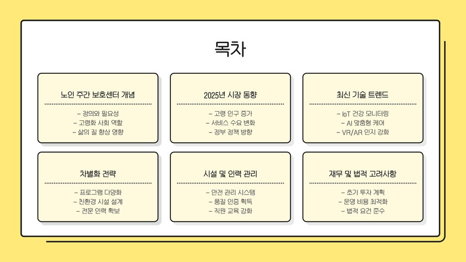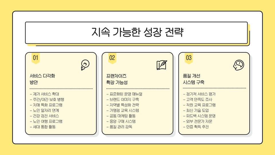 노인 주간 보호센터 창업은 단순한 사업이 아닌, 사회적 가치와 함께 하는 일입니다. 앞으로의 트렌드를 반영하여 많은 사람들이 혜택을 받을 수 있도록 최선을 다하길 바랍니다.