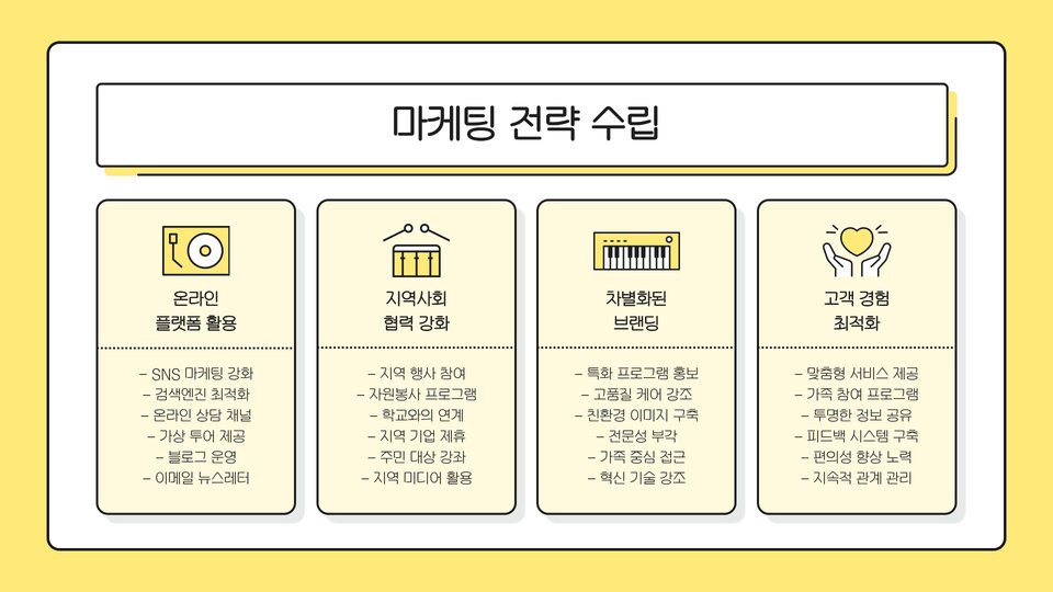 | 마케팅 전략 | 온라인 및 오프라인 홍보 |
