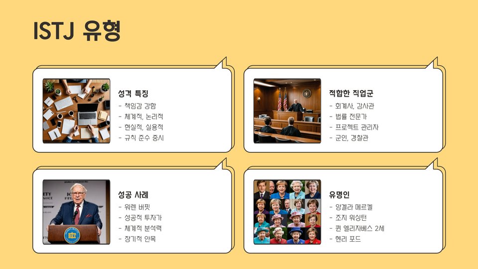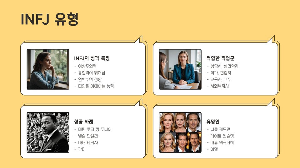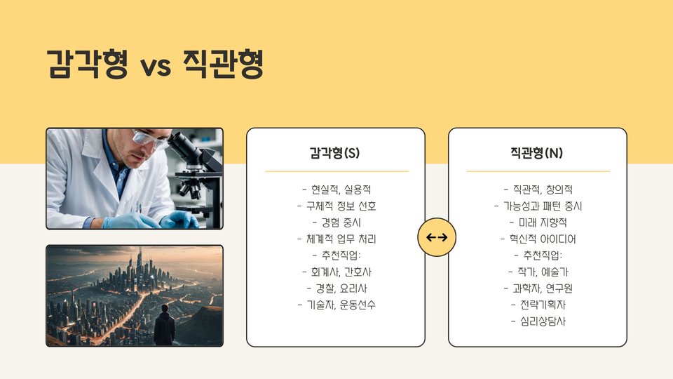 - 성격 유형에 따라 적합한 직업군이 다르게 나타납니다.