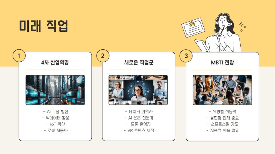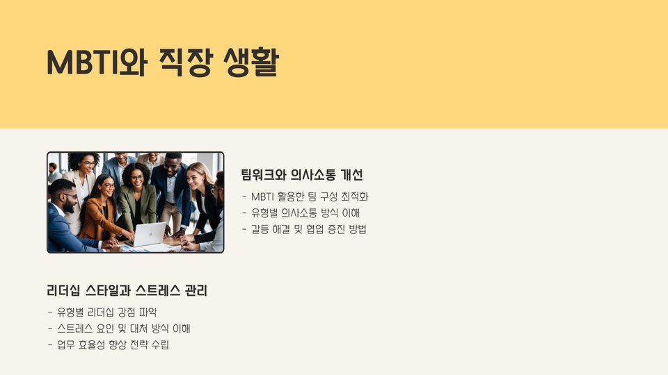 - MBTI를 통해 보다 만족스러운 직업 경로를 계획할 수 있습니다.