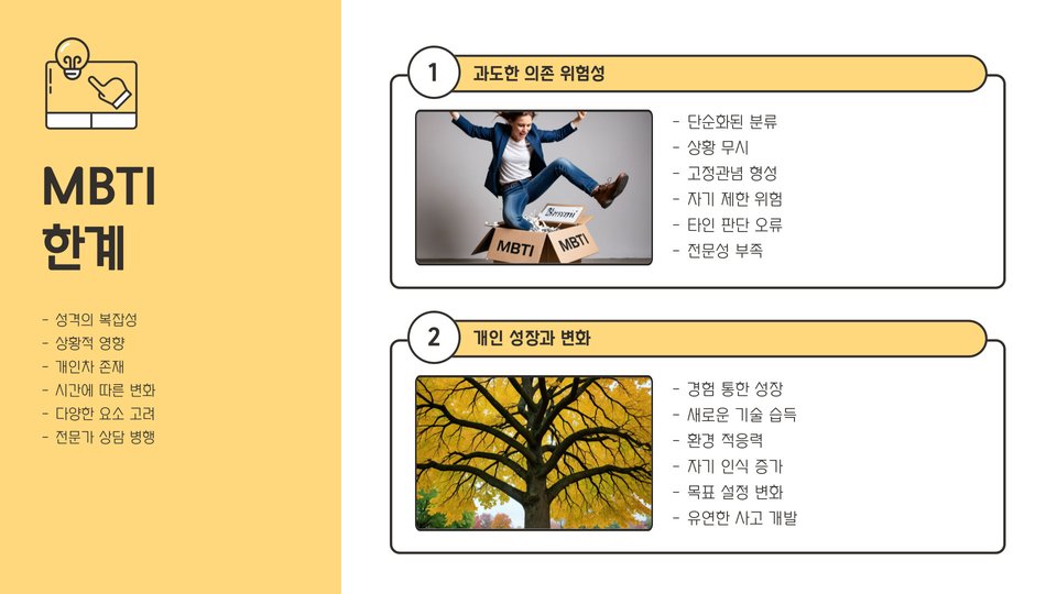 - MBTI는 개인의 성격을 16가지 유형으로 나누어 직업 선택에 도움을 줍니다.
