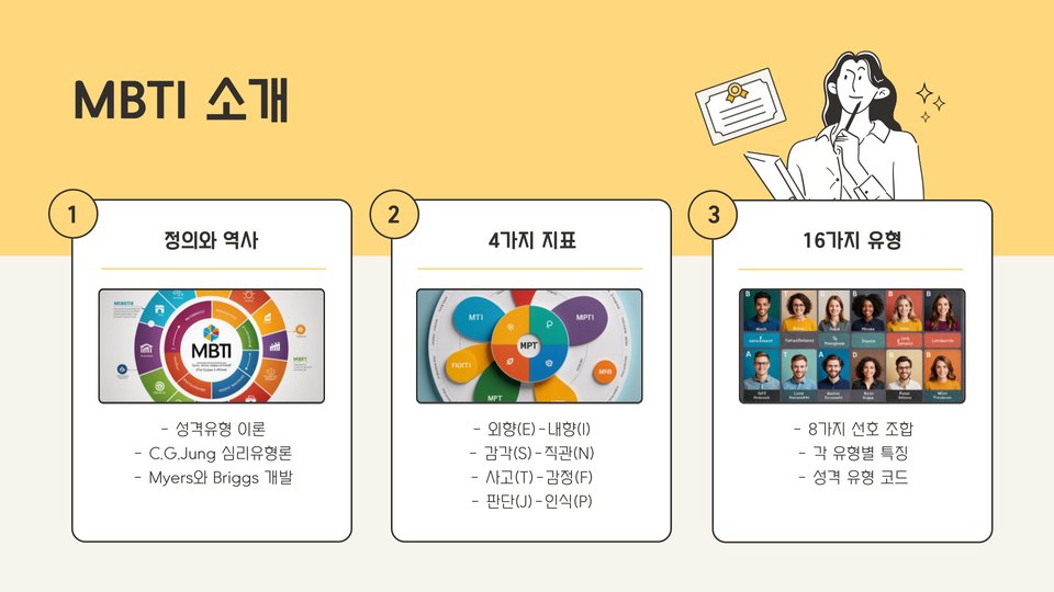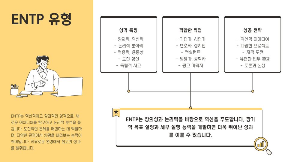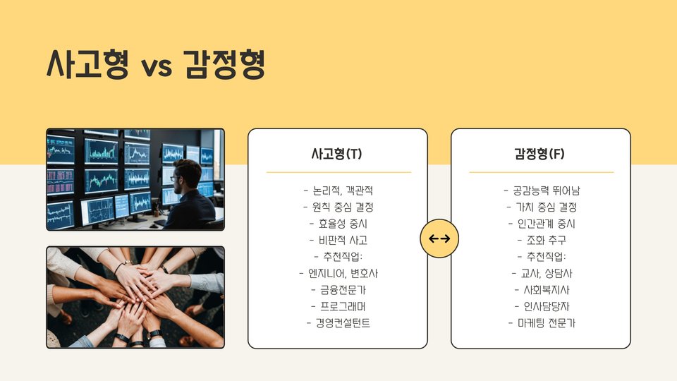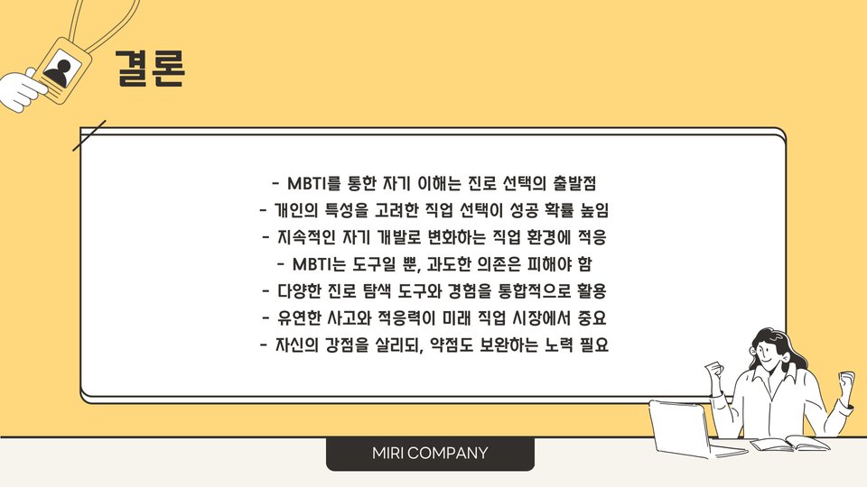 - MBTI를 통해 보다 만족스러운 직업 경로를 계획할 수 있습니다.
