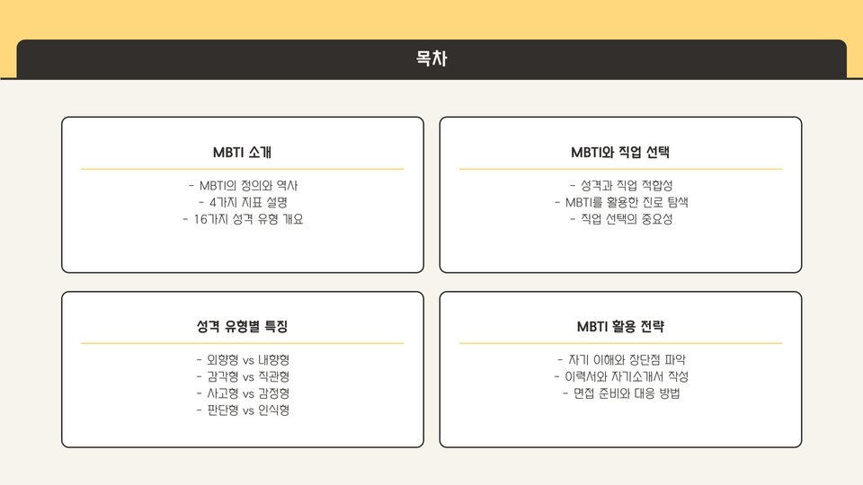 직업 선택은 인생에서 매우 중요한 결정 중 하나입니다. MBTI 성격 유형 진단은 개인의 성격을 이해하고 적합한 직업을 찾는 데 유용한 도구로 많이 활용됩니다. 이 가이드는 MBTI 성격 유형에 따른 직업 추천과 이를 위한 취업 비법을 소개합니다. 저희는 각 성격 유형에 대해 설명하고, 그에 맞는 직업 예시를 제시할 예정입니다. 이해가 쉽게 설명하겠습니다.