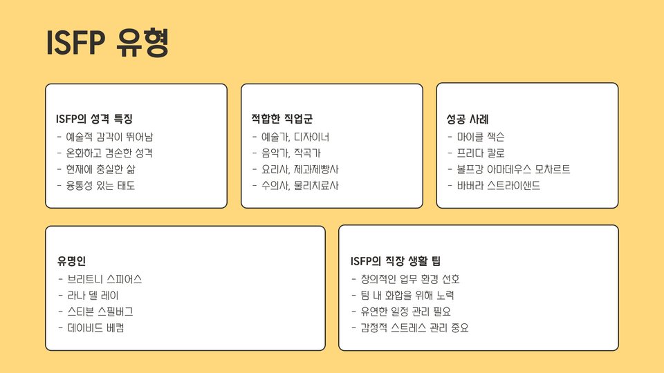 또한, ISFP 유형은 예술적인 감각과 함께 독창적인 작업을 잘 수행할 수 있어, 디자인이나 예술 분야에서 성공할 가능성이 높습니다. 이처럼 성격 유형에 따라 직업의 적합성이 달라지므로, 자신의 MBTI 유형을 파악하는 것이 중요합니다.