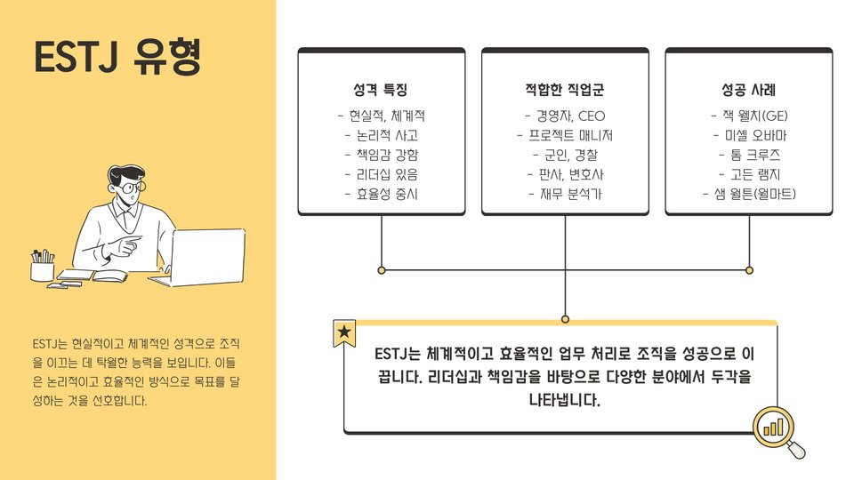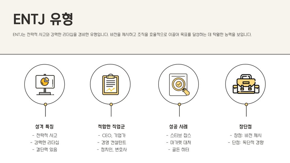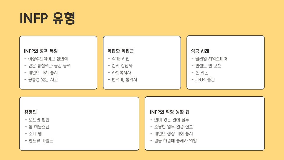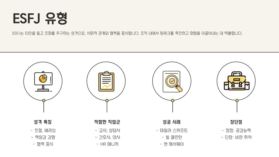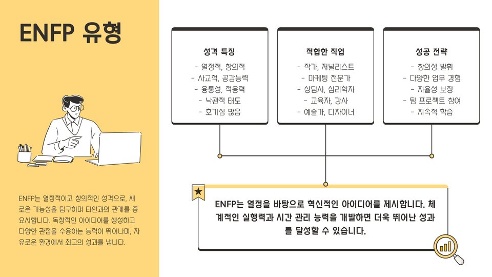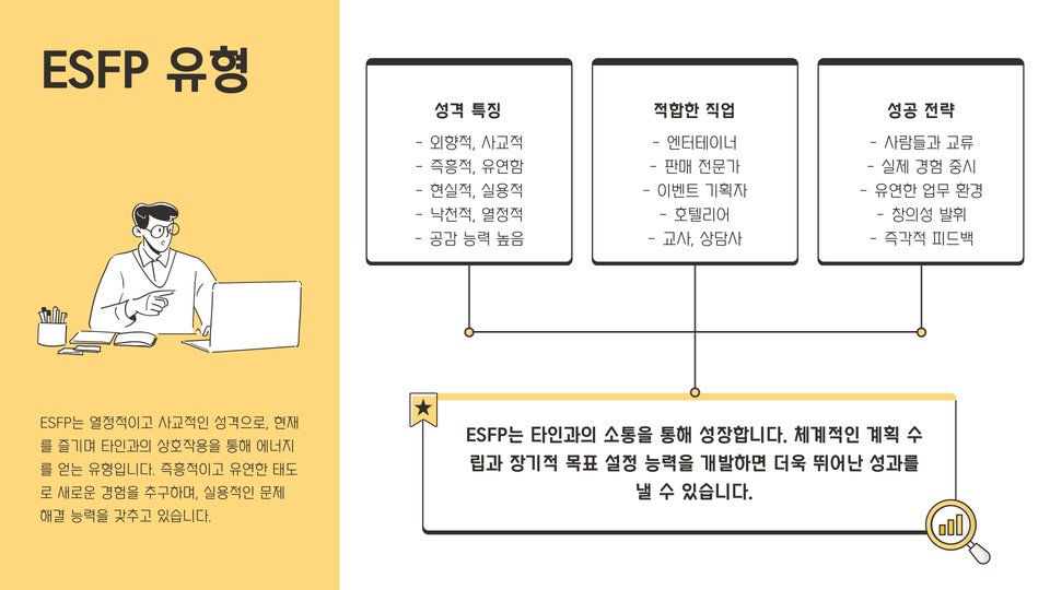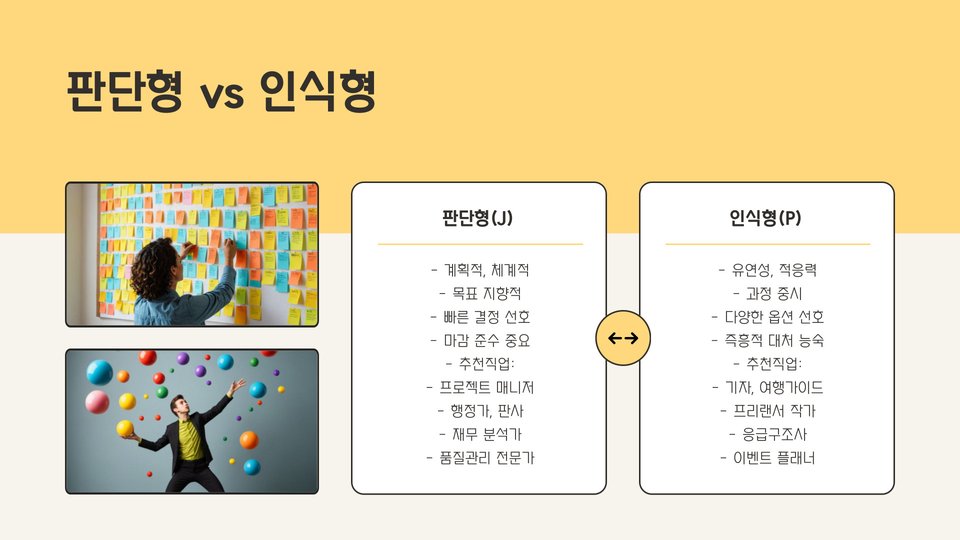 - 성격 유형에 따라 적합한 직업군이 다르게 나타납니다.