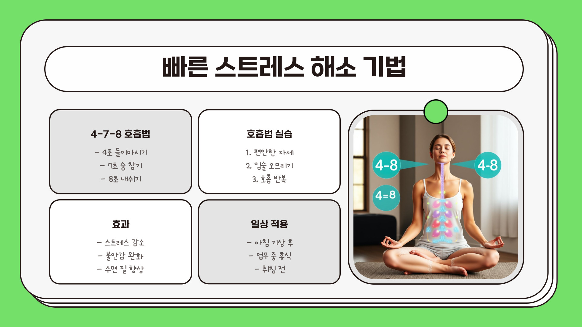 - 스트레스 관리에는 심호흡, 산책, 스트레칭이 효과적입니다.