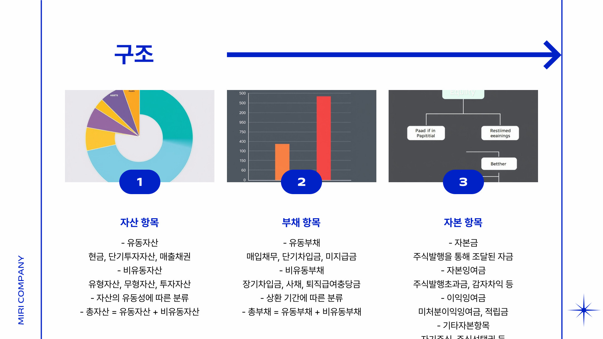 대차대조표는 크게 세 가지 주요 구성 요소로 나뉩니다: 자산, 부채, 자본입니다. 자산은 기업이 소유하고 있는 모든 경제적 자원을 포함하며, 유동자산과 비유동자산으로 구분됩니다. 유동자산은 1년 이내에 현금화할 수 있는 자산을, 비유동자산은 1년 이상 보유할 자산을 의미합니다.