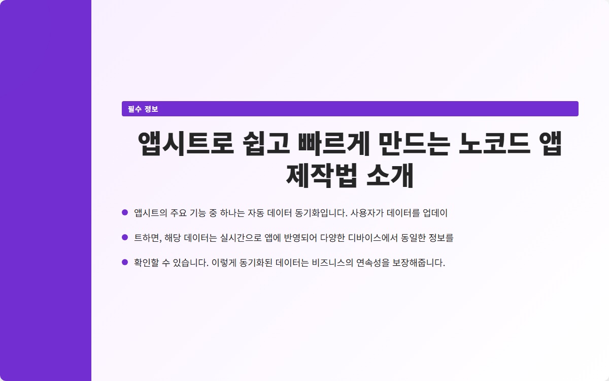 앱시트의 주요 기능 중 하나는 자동 데이터 동기화입니다. 사용자가 데이터를 업데이트하면, 해당 데이터는 실시간으로 앱에 반영되어 다양한 디바이스에서 동일한 정보를 확인할 수 있습니다. 이렇게 동기화된 데이터는 비즈니스의 연속성을 보장해줍니다.