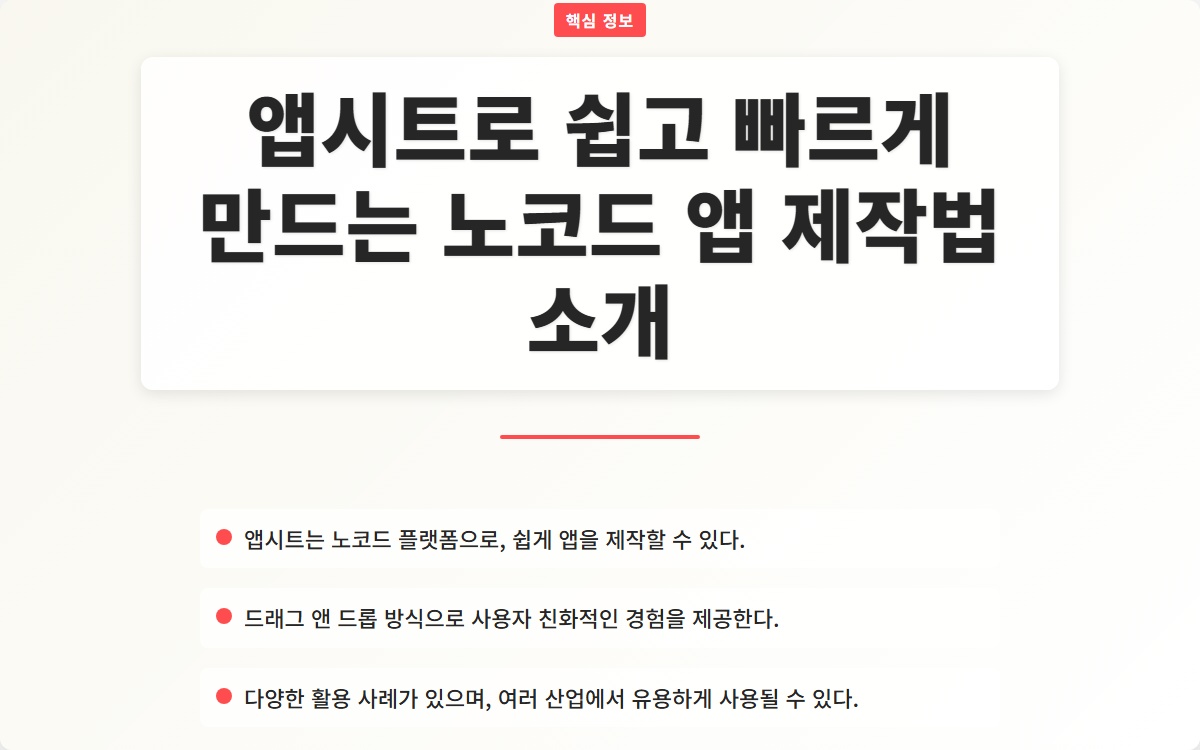 앱시트의 가장 큰 장점 중 하나는 드래그 앤 드롭 방식으로 앱을 제작할 수 있다는 점입니다. 이 방식은 사용자에게 친숙한 경험을 제공하며, 몇 번의 클릭만으로도 원하는 앱을 만들 수 있게 해줍니다.