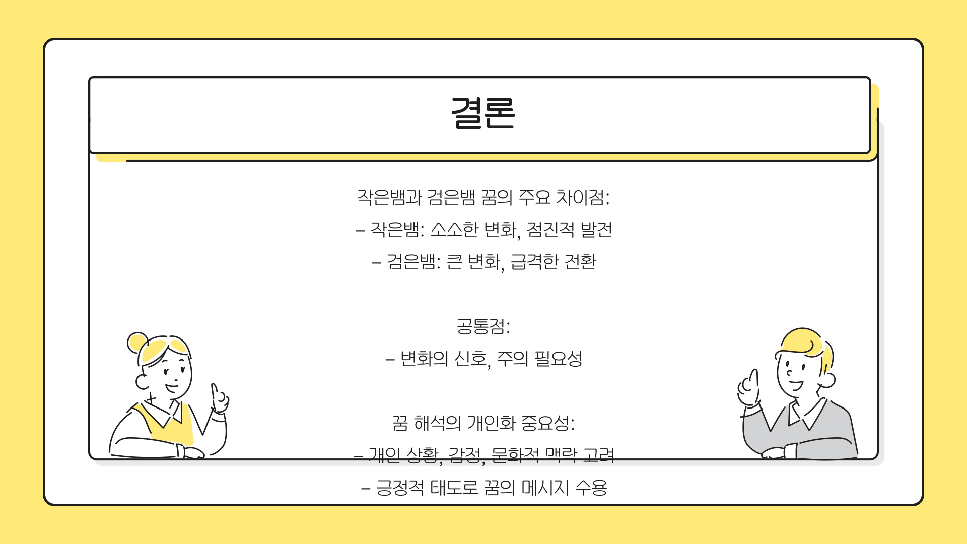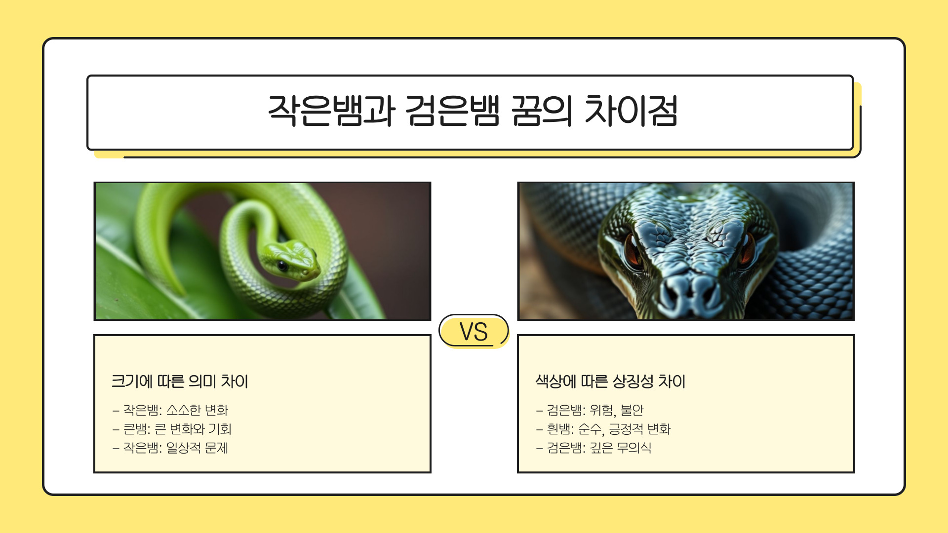 두 꿈 모두 자기 성찰의 기회를 제공하지만, 작은뱀의 꿈은 긍정적인 변화나 성장을 나타내는 반면, 검은뱀의 꿈은 내면의 불안을 인식하고 해결하는 과정을 요구합니다. 이러한 구별을 통해 꿈의 의미를 보다 명확하게 이해할 수 있습니다.