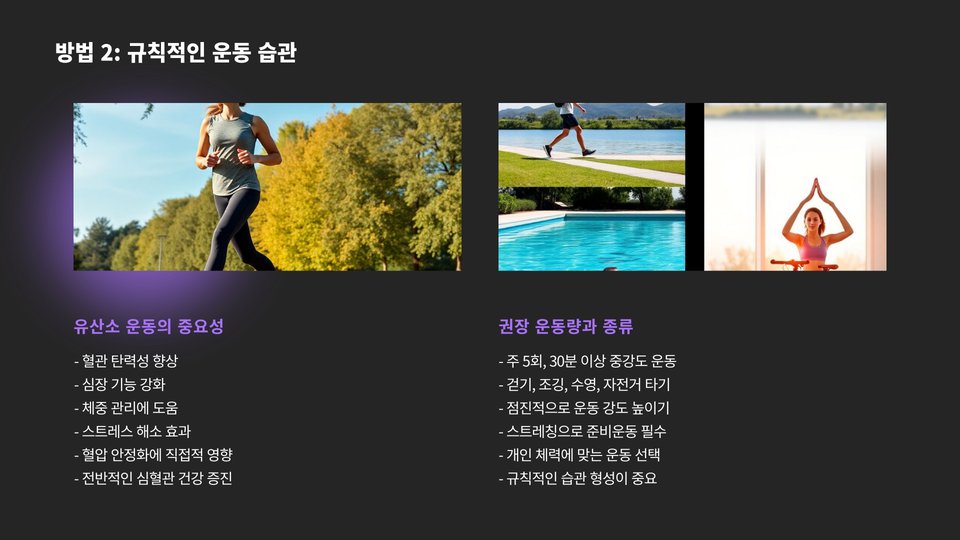 운동은 혈압을 조절하는 데 필수적입니다. 주 150분 이상의 유산소 운동을 추천합니다. 걷기, 자전거 타기, 수영 등은 가장 쉬운 방법입니다. 이렇게 하면 심장 건강을 개선하고, 체중을 조절하기도 쉽습니다.