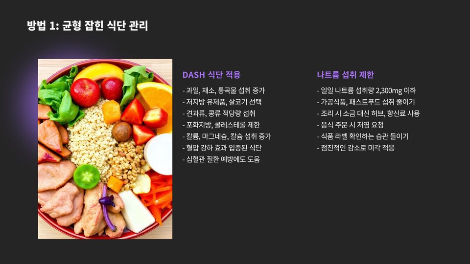 균형 잡힌 식단은 혈압을 조절하는 데 큰 영향을 미칩니다. 건강한 식단은 과일, 채소, 전곡류, 저지방 단백질로 구성되어야 합니다. 특히, 칼륨이 풍부한 식품은 나트륨의 영향을 완화시켜 혈압을 낮추는 데 도움을 줍니다. 바나나, 시금치, 감자 등이 그 예입니다. 또한, 가공식품과 소금이 많이 포함된 음식은 피하는 것이 좋습니다.