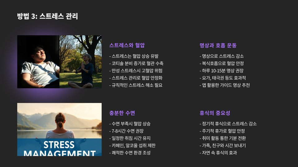 스트레스는 혈압을 높이는 주요 원인 중 하나입니다. 일상에서 만나는 다양한 스트레스를 효과적으로 관리하는 방법은 여러 가지가 있습니다. 명상, 요가, 깊은 호흡 같은 이완 기법들이 도움이 됩니다.