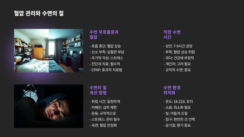 수면의 질을 높이기 위해 잠자리에 들기 전 전자기기 사용을 줄이고, 카페인이 포함된 음료를 피하는 것이 좋습니다. 또한, 편안한 수면 환경을 조성하여 숙면을 취할 수 있도록 노력해야 합니다. 이러한 방법들은 혈압을 안정적으로 유지하는 데 큰 도움이 됩니다.