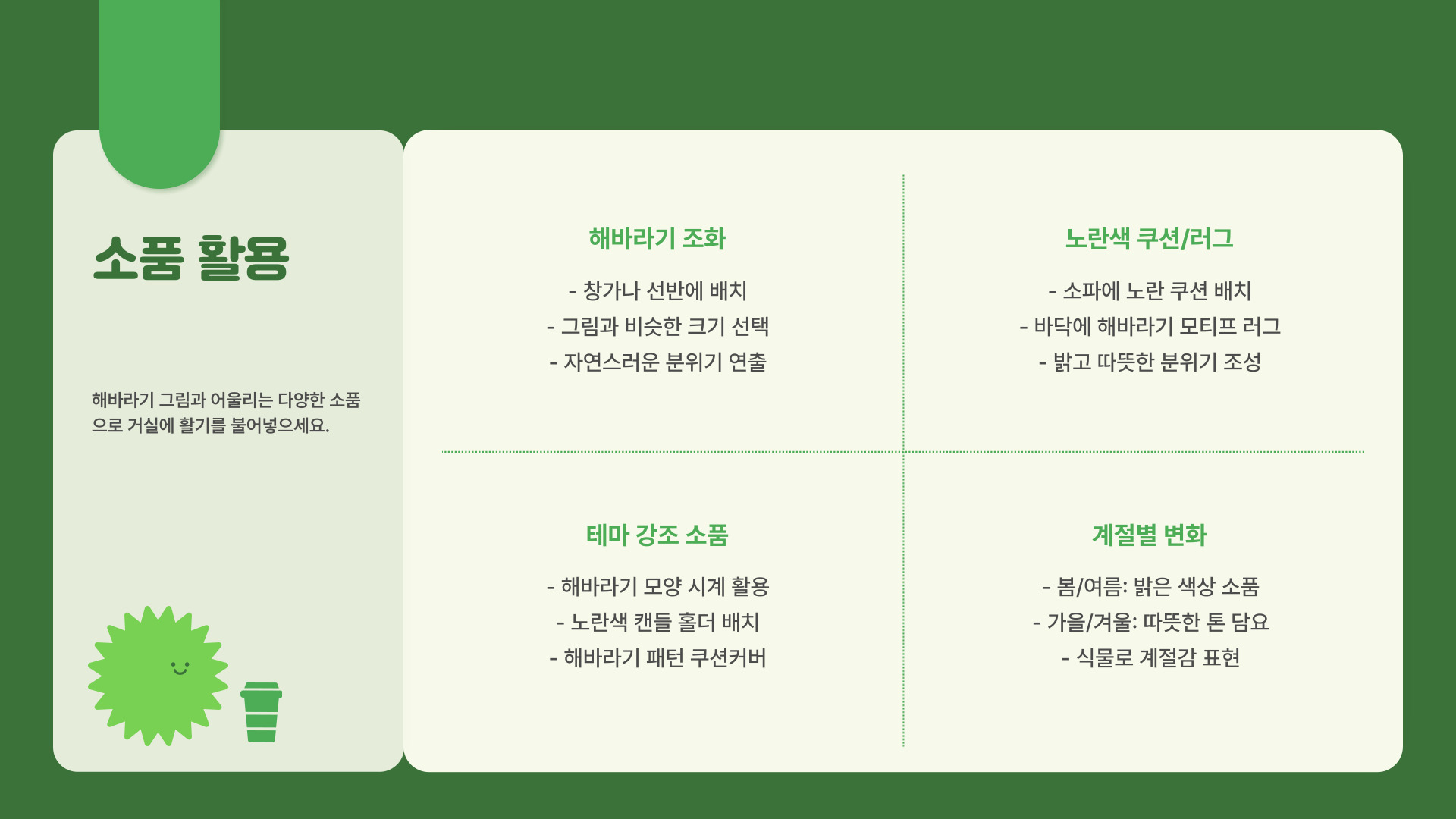 - 해바라기와 어울리는 소품으로 통일감을 주는 것이 좋습니다.